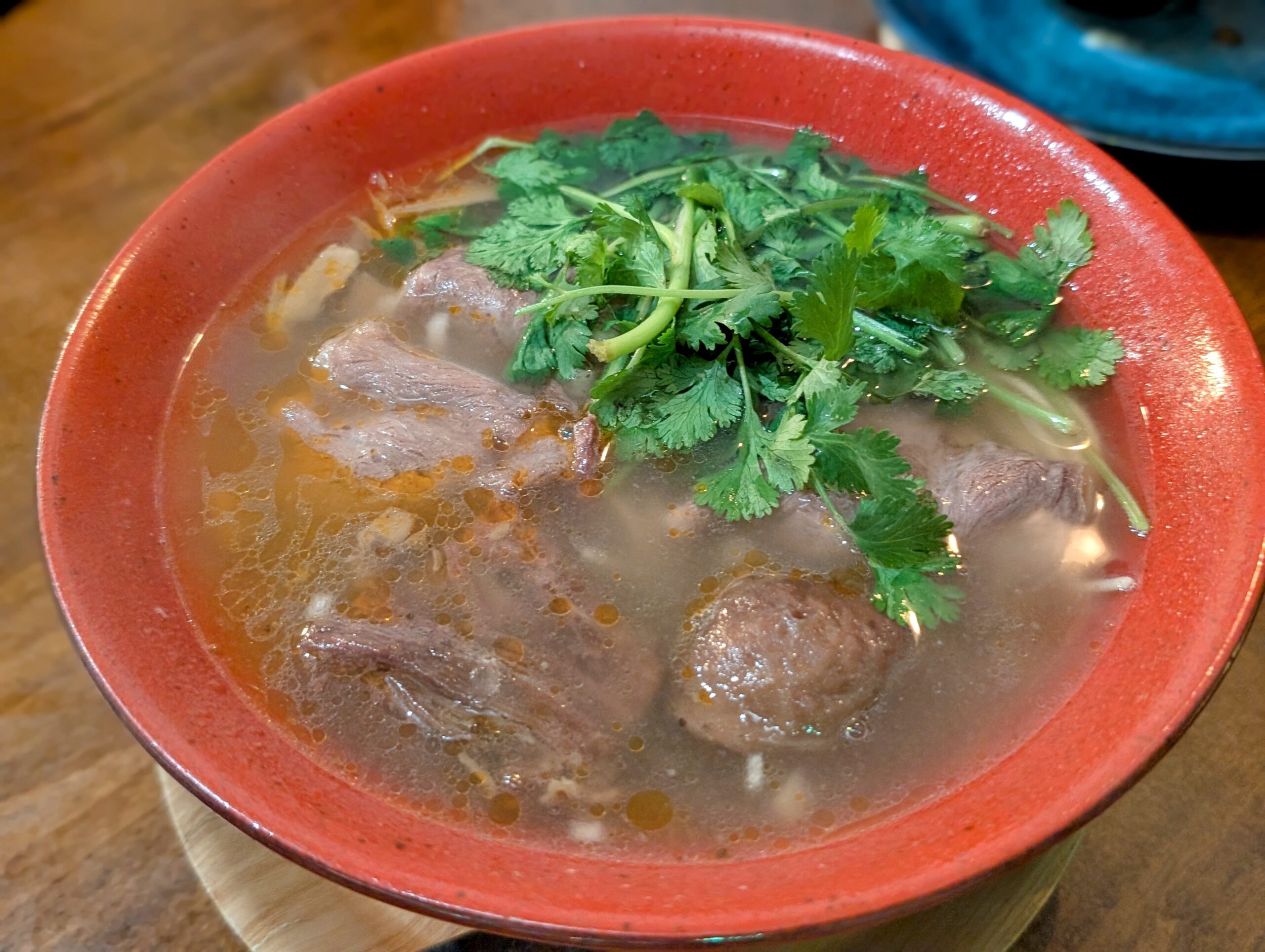 Loại mì thứ hai là mì với thịt bò hầm, có vài lát thịt bò với một miếng bắp bò và một viên bò viên với chút ngò trong nước súp được nấu từ xương bò. Nước súp bò đầy vị thơm bò từ xương bò, lại đậm vị ngọt nhưng ăn rất dễ chịu. Những lát thịt bò tuy mềm nhưng vẫn có chút độ dai, đậm vị béo tự nhiên của bò, ăn với chút tương ớt đặc biệt của nhà hàng rất ngon. Bắp bò được hầm mềm, nhưng vẫn còn những miếng gân hơi dai, và bò viên thì dai giòn khó chê được. Ngôi sao của món ăn này vẫn là những sợi mì hơi dai, đầy mùi thơm của lúa mạch và trứng, thấm hết nước súp bò.