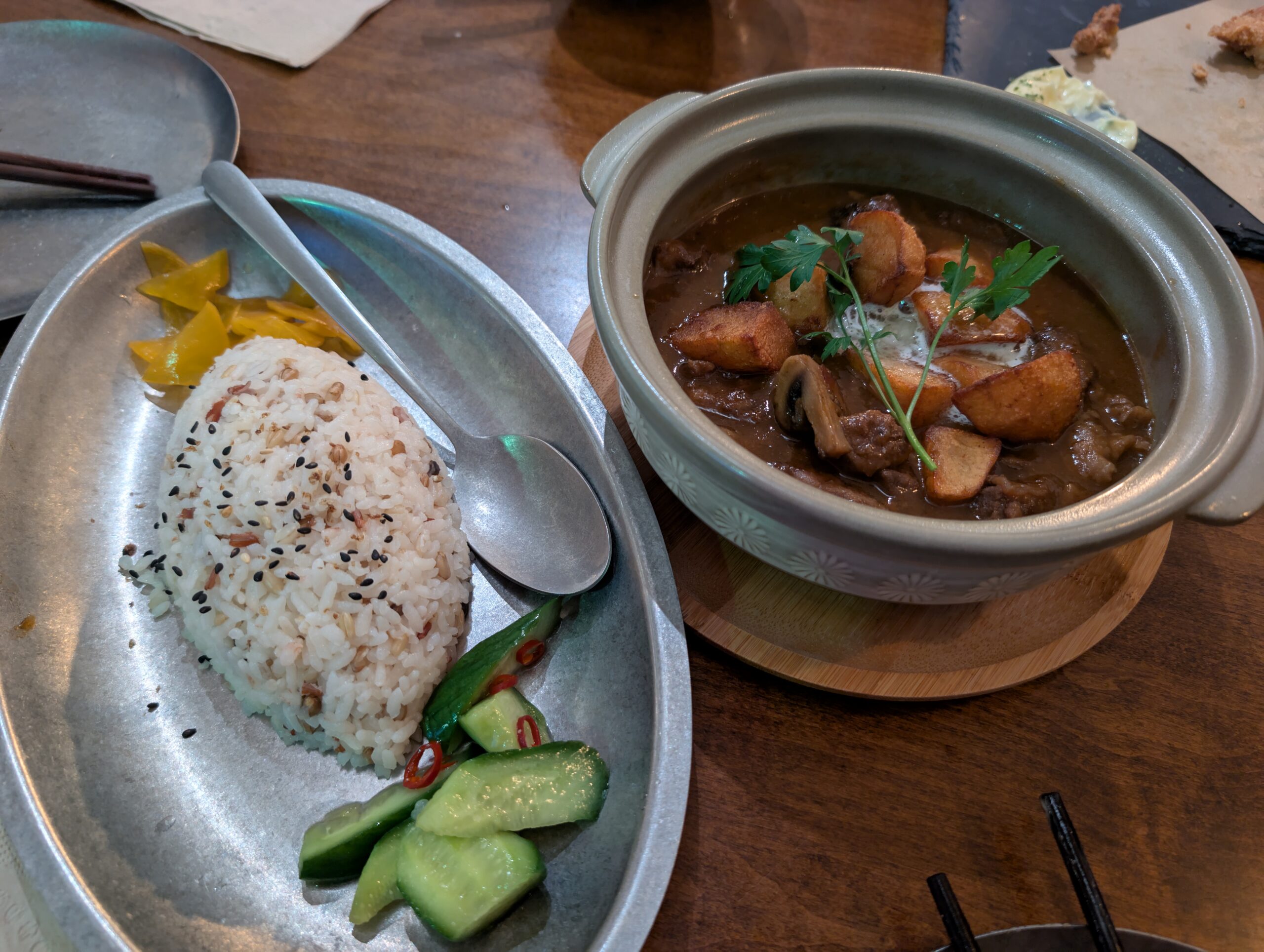 Cuối cùng là món cơm với sườn bò hầm rượu vang, có những miếng sườn bò được hầm trong nước xốt có rượu vang, nấm và có thêm những miếng khoai tây chiên ăn kèm, có thêm củ cải chua và dưa leo trộn. Nước xốt hầm bò có mùi vị ngọt ngào, thêm chút mùi nồng từ rượu vang rất ngon.