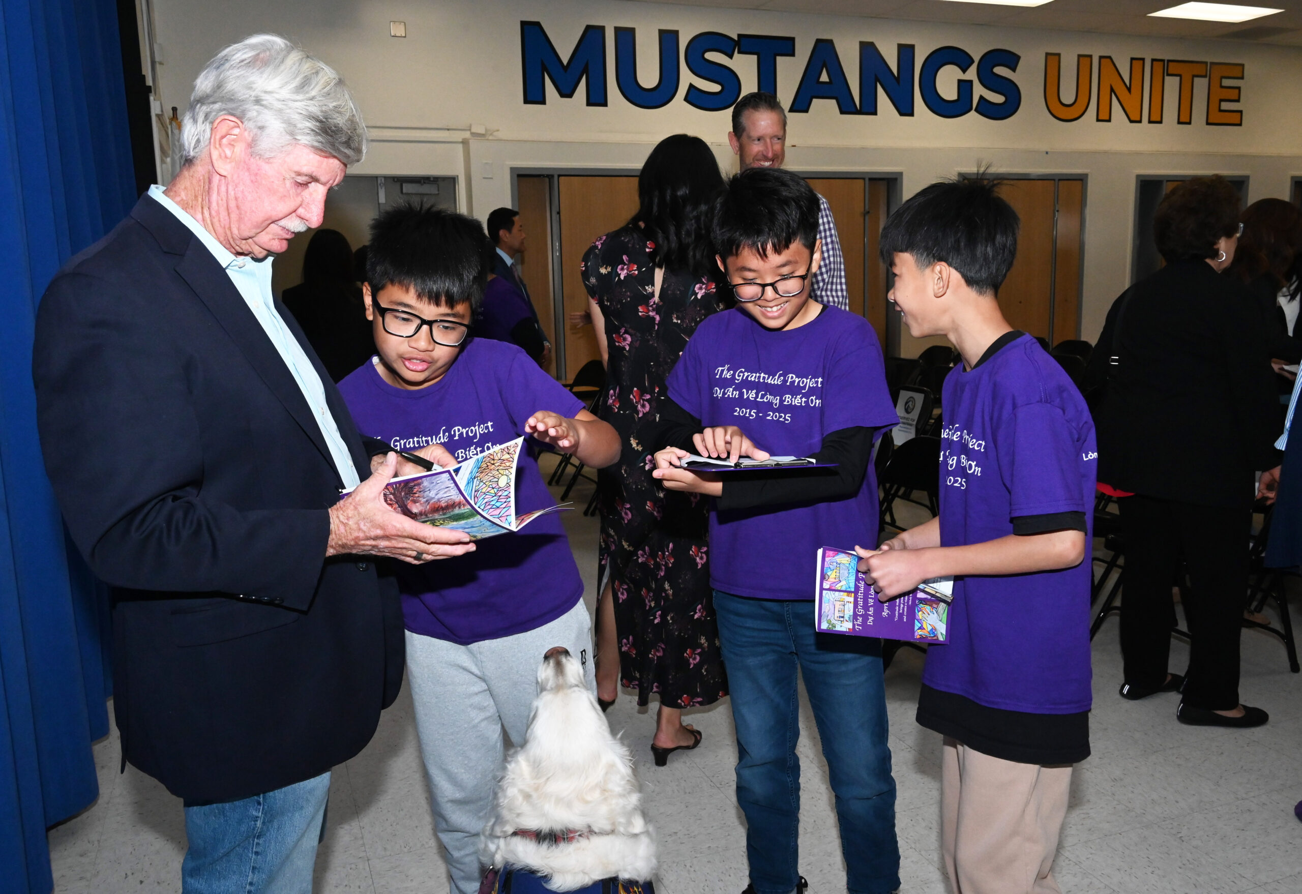 Các học sinh xin chữ ký từ ông Andy McTigue, cựu chiến binh Mỹ, kỷ niệm 10 năm “Dự Án Về Lòng Biết Ơn.” (Hình: Văn Lan/Người Việt)