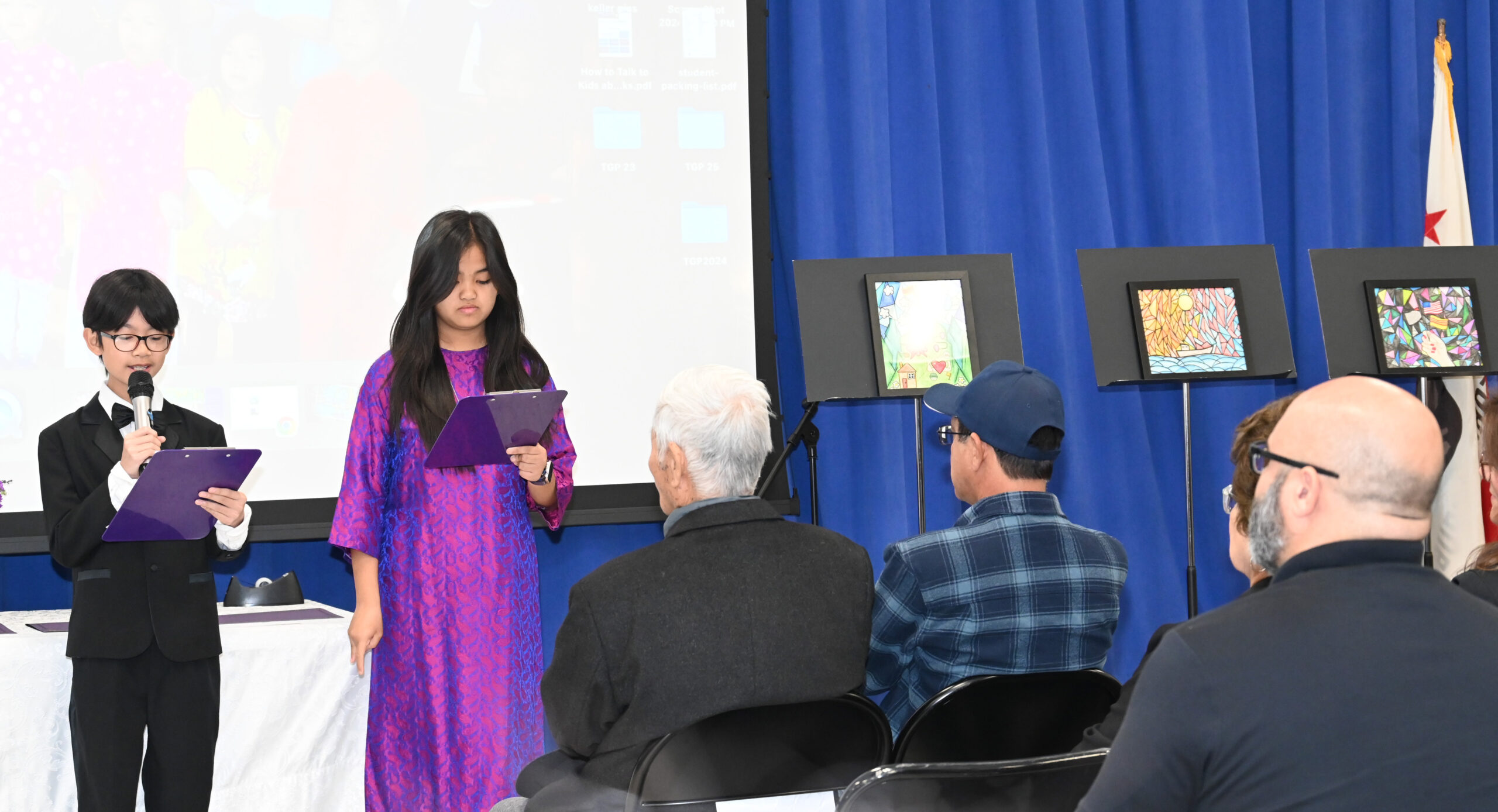 Từ trái, học sinh Audrey Nguyễn và Kenny Lương, nói về “Dự Án Về Lòng Biết Ơn.” (Hình: Văn Lan/Người Việt)