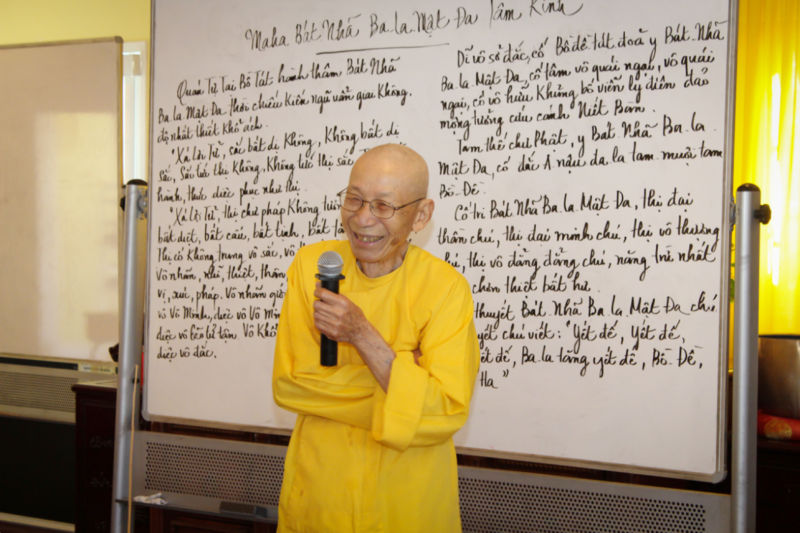 “Tôi sang Mỹ khi đã 65 tuổi. Ngày tôi ra tù, gặp lại gia đình, thì thấy không giống như ngày xưa nữa. Tôi đi vắng mặt 12 năm, con cái tôi lớn hết ráo rồi, tôi đâu còn như ông bố ngày xưa để dạy dỗ con nữa, tôi lạc hậu, không biết gì hết. Nhớ lại thời gian trong tù chép kinh, tôi nhớ lời Phật dạy, và thấy trong người khỏe hơn, nên nghĩ đến chuyện xin gia đình cho xuất gia. Chính vì vậy, khi ở Buffalo, tôi có nói với mấy đứa nhỏ, mà chúng nó chưa đồng ý đâu. Mãi cho đến cuối năm 1999 thì tôi mới được con cái chấp nhận cho đi tu, và đầu năm 2000 tôi trở thành ông tăng,” ông kể tiếp.