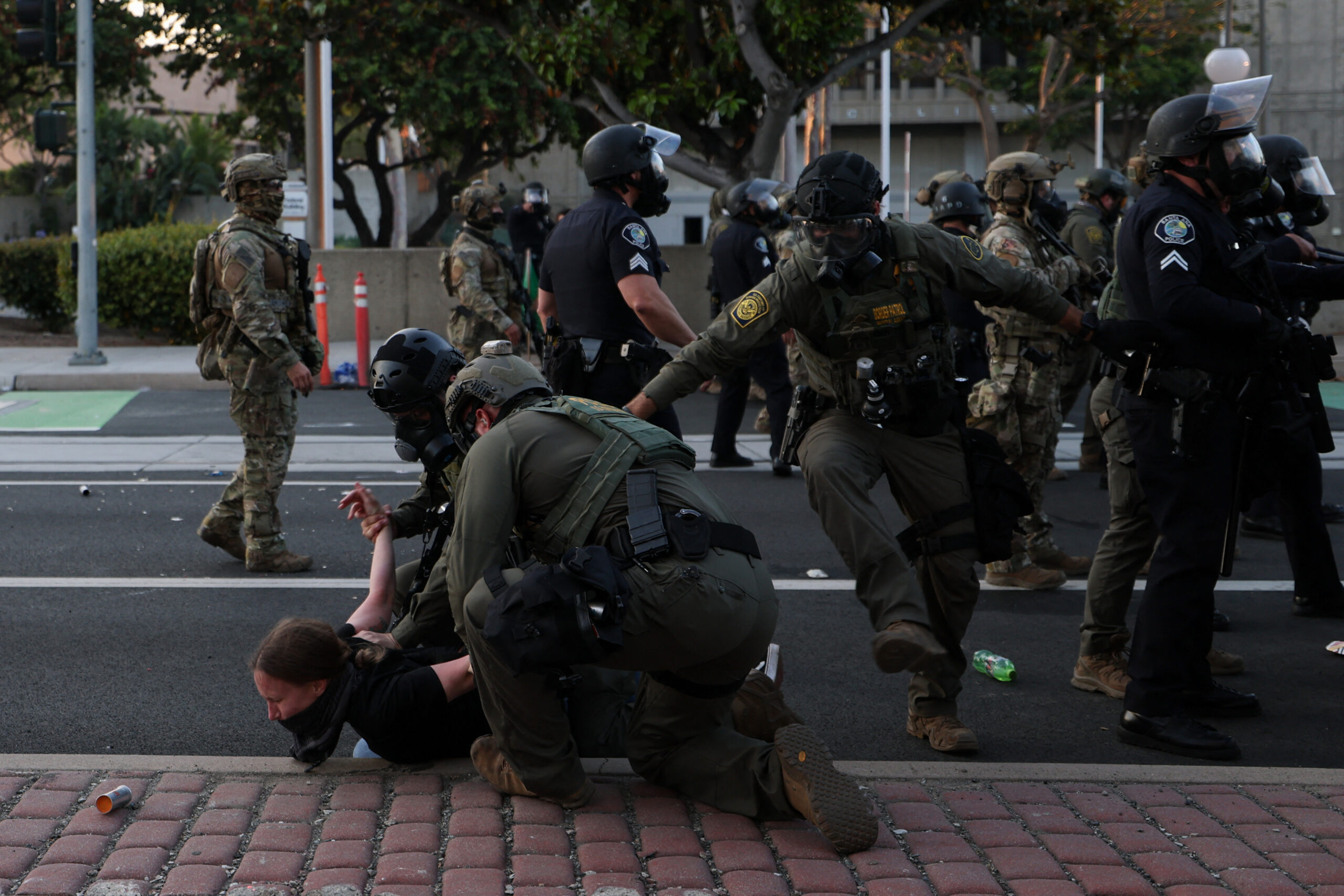 SANTA ANA, California (NV) – Vệ Binh Quốc Gia (VBQG) chặn đường ở một số khu vực trong Civic Center của Orange County sáng Thứ Ba, 10 Tháng Sáu, sau một ngày chiến dịch trấn áp người nhập cư khắp Nam California của Cảnh Sát Di Trú (ICE) lan tới quận hạt này, gây ra những vụ đụng độ dữ dội giữa người biểu tình với nhân viên công lực ở trung tâm Santa Ana, theo nhật báo The Orange County Register.
