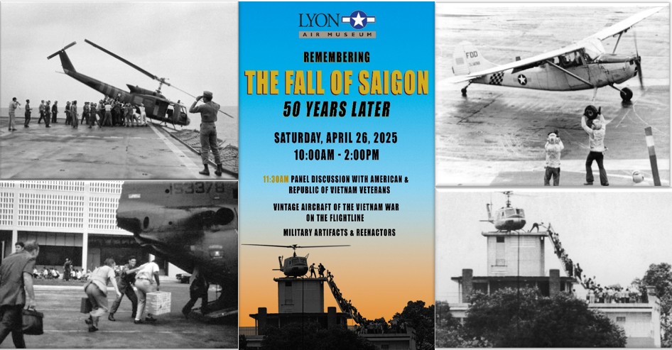SANTA ANA, California (NV) – Viện bảo tàng Lyon Air Museum sẽ tổ chức “The Fall of Saigon: 50 Years Later” (Sài Gòn Thất Thủ – 50 Năm Sau) bao gồm thảo luận và triển lãm liên quan đến Tháng Tư Đen, một sự kiện quan trọng của cộng đồng Việt Nam, từ 10 giờ sáng đến 2 chiều, Thứ Bảy, 26 Tháng Tư, tại địa chỉ 19300 Ike Jones Road, Santa Ana, CA 92707 (sát phi trường John Wayne), điện thoại 714-210-4585.