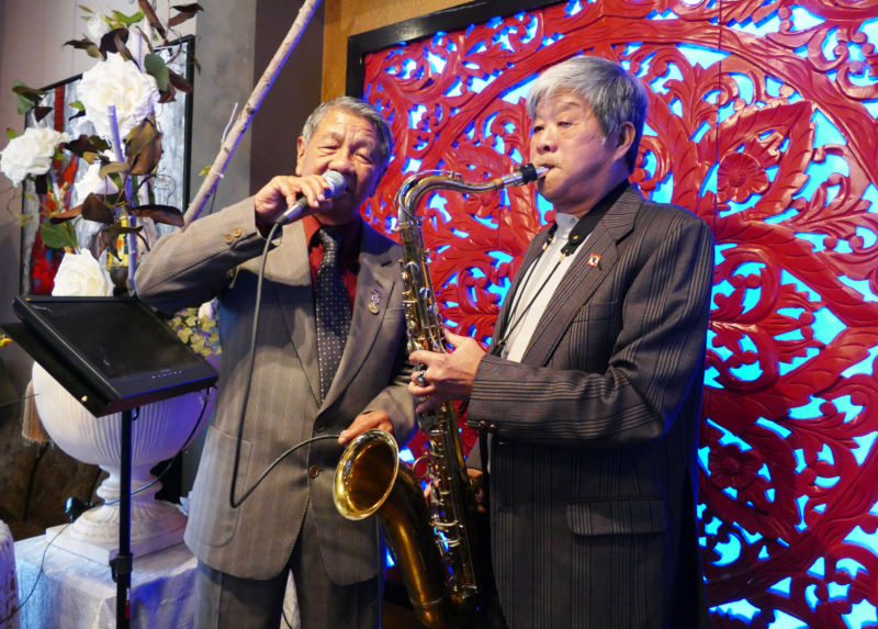 Võ Sư Từ Võ Hạnh (trái) và Võ Sư Phạm Gia Cổn say sưa trong nhạc phẩm “Tôi Đi Giữa Hoàng Hôn” trong lễ kỷ Niệm 5 năm thành lập Viện Nghiên Cứu Võ Học Global. (Hình: Văn Lan/Người Việt)