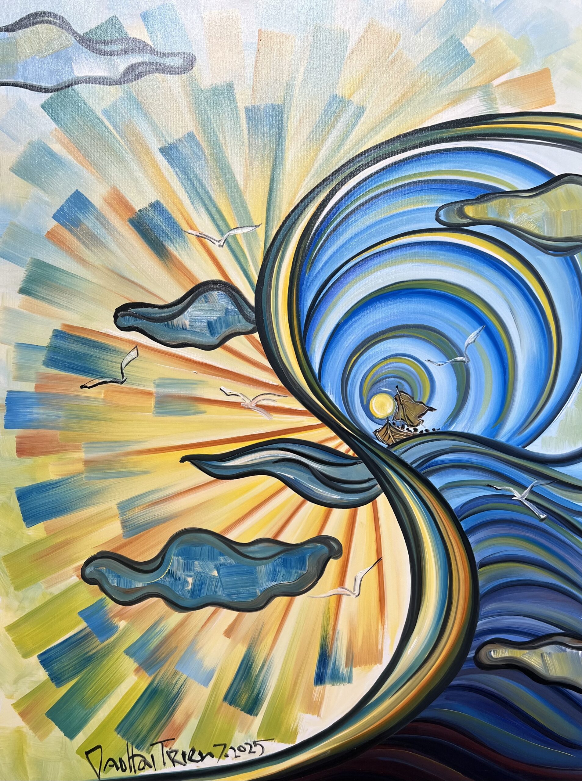 Họa sĩ Đào Hải Triều chia sẻ tiếp: “Khi nhìn đôi mắt của người nữ tài công lèo lái con thuyền giữa trời đất mịt mù, và cô đã đưa chiếc ghe 2197/3-6 chở 40 thuyền nhân trong chuyến vượt biển năm xưa đến được bến bờ tự do. Hiện thực đó cho thấy sự dũng cảm vượt qua mọi gian nan, vì sự sống, vì tự do, mà con người đã làm được. Đó là điều con người đã thực hiện để phục vụ cho đời sống, được thể hiện qua bức tranh.”