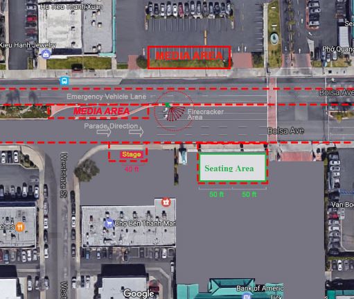 – Các đơn vị tham dự diễn hành sẽ tập trung tại khu vực giữa Newland và ngã tư Magnolia và Bolsa.