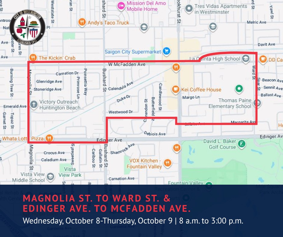 Hai ngày 8 và 9 Tháng Mười: Khu vực ảnh hưởng (hình chữ nhật) từ đường Magnolia đến đường Ward và từ đường Edinger đến đường McFadden.