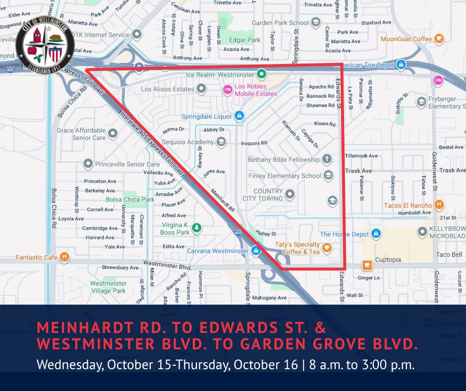 Hai ngày 15 và 16 Tháng Mười: Khu vực ảnh hưởng từ đường Meinhardt tới đường Edwards và từ đường Westminster đến đường Garden Grove.