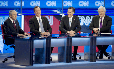 Phải làm gì nếu tới đại hội đảng mà giữa 4 ứng cử viên chưa ngã ngũ? Ðó là điều đảng Cộng Hòa đang phải chuẩn bị – cho trường hợp các ứng cử viên, từ trái: Ron Paul, Rick Santorum, Mitt Romney, Newt Gingrich, vẫn chưa ai có đủ phiếu để thắng trọn trước đại hội. (Hình: Don Emmert/AFP/Getty Images)
