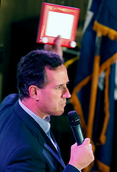 Sau khi phía Romney so sánh việc chuyển từ tranh cử nội bộ qua tranh cử với Tổng Thống Obama là việc “xóa tấm Etch-A-Sketch làm lại từ đầu,” ứng cử viên Rick Santorum, trong hình, bắt đầu dùng món đồ chơi này làm biểu tượng rằng Romney không tin tưởng được, tiện đâu nói đấy chỉ để kiếm phiếu chứ không thật lòng. (Hình: AP Photo/Bill Haber)