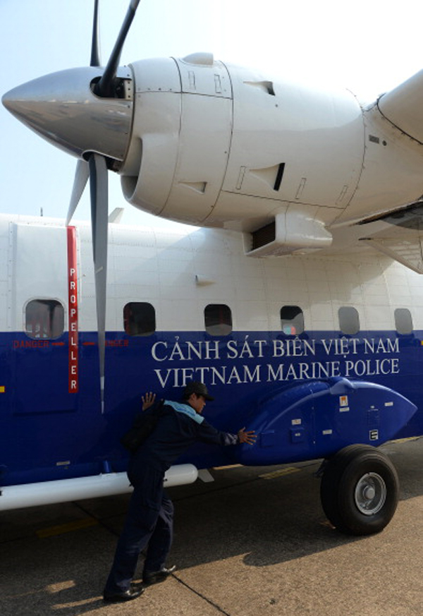 Ground workers push a Vietnam Coast Guard Casa aircraft in this file photo. Debris from a similiar Vietnamese Coast Guard plane with nine passengers on board was found. (Photo: Hoang Dinh Nam/AFP/Getty Images)