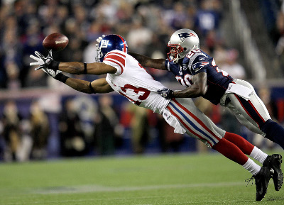 Rames Barden số 13 của New York Giants lao người tới ôm banh ngay phía sau là đấu thủ phòng ngự Phillip Adams số 26 của New England Patriots trong trận đấu diễn ra vào ngày 6 Tháng Mười Một năm 2011 trên sân Gillette Stadium, Foxboro, Massachusetts. (Hình: Jim Rogash/Getty Images)