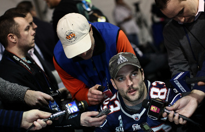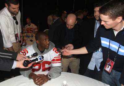 Antrel Rolle số 26 của New York Giants trả lời những câu hỏi của báo chí về Super Bowl XLVI tại Indianapolis Downtown Marriott, Indianapolis, Indiana ngày 2 Tháng Hai, 2012. (Hình: Scott Halleran/Getty Images)