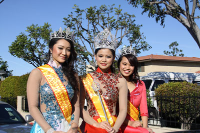 Các sinh viên vừa đoạt giải Hoa Khôi Liên Trường 2012 tham gia diễn hành Tết. Từ trái: Kymberly Ngọc Nguyễn, 20 tuổi, Á Khôi, sinh viên UC Irvine, Nguyễn Hằng Ny, 22 tuổi, Hoa Khôi, sinh viên West Coast University, và Ngô Thùy An, 21 tuổi, Á Khôi, sinh viên UC Irvine. (Hình: Ngọc Lan/Người Việt) |