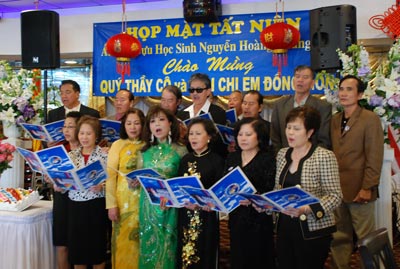 Ban hợp ca cựu nam nữ sinh Nguyễn Hoàng trong một ca khúc “nhạc thời chinh chiến” tại buổi họp mặt Tất Niên. (Hình: Nguyên Huy/Người Việt)