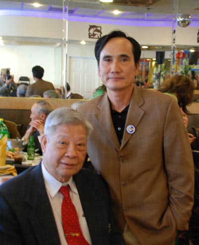 “Tỉnh Quảng Trị trở thành nơi địa đầu giới tuyến trực tiếp nhận lãnh những hậu quả của chiến tranh. Khi cuộc chiến lên cao điểm vào năm 1972, quân cộng sản từ Bắc tràn xuống bất kể vùng phi quân sự đã biến Quốc Lộ I trong tỉnh thành ‘đại lộ kinh hoàng.’ Trường chúng tôi phải tạm dời về Ðà Nẵng, thầy trò nương đỡ nhau trong Trại 5 Non Nước để việc học của chúng tôi không bị gián đoạn. Khi chiến tranh tạm lắng, nhiều nơi trong tỉnh cũng như thị xã Quảng Trị đầy cảnh tan hoang trong đó có trường Nguyễn Hoàng. Thế là thầy trò lại cùng nhau góp sức xây dựng lại trường với sự giúp đỡ của tỉnh,” ông Hùng kể tiếp. Cựu Hội Trưởng Lê Xuân Hùng (phải) và cựu Ðại Tá Tỉnh Trưởng Quảng Trị Hà Mai Việt tại buổi Tất Niên. (Hình: Nguyên Huy/Người Việt)