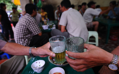 Hai người cụng ly tại một quán bia hơi ở Hà Nội. (Hình: HOANG DINH NAM/AFP/Getty Images)