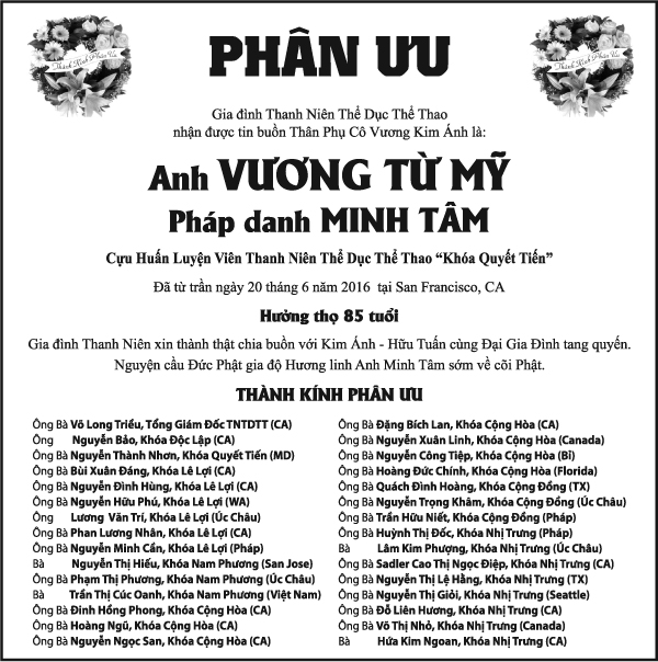 Anh Vương Từ Mỹ June 23, 2016 : 8:15 PM FacebookXEmailPrint FacebookXEmailPrint CO THE BAN QUAN TAM Bà Trần Thị Sâm April 21, 2026 : 6:15 PM Cụ Bà Trần Thị Sâm April 21, 2026 : 6:13 PM Đồng Chí Nguyễn Hữu Thời April 21, 2026 : 6:05 PM Cụ Ông Nguyễn Hữu Thời April 19, 2026 : 7:12 PM Bác Sĩ Trần Cao Đễ April 17, 2026 : 6:38 PM Chị Đoàn Thị Anh April 17, 2026 : 6:38 PM Ông Đinh Gia Rũng April 16, 2026 : 6:36 PM Cựu Nữ Sinh TV 58-65 Maria Nguyễn Thị Hồng Tước April 15, 2026 : 7:33 PM [disqus_shortcode_codeable] Cáo Phó Ông Vũ Công Thành April 17, 2026 : 6:34 PM Bác Sĩ Trần Cao Để April 17, 2026 : 6:30 PM Cụ Ông Nguyễn Hữu Thời April 17, 2026 : 6:28 PM Ông Đỗ Duy Đức April 17, 2026 : 6:26 PM Cảm Tạ Luật Sư Nguyễn Xuân Nghĩa April 17, 2026 : 6:36 PM Cụ Ông Phạm Văn Khỏe April 2, 2026 : 6:09 PM Bà Nguyễn Thị Thúy Ban March 30, 2026 : 4:08 PM Bà Quả Phụ Lê Khánh March 27, 2026 : 6:17 PM Tưởng Nhớ Huynh Trưởng Du Ca Nguyễn Thiện Cơ January 16, 2026 : 4:54 PM Những buổi tối nơi căn nhà trong hẻm Thành Thái October 19, 2025 : 12:59 PM Doãn Quốc Sỹ, nhà văn, nhà giáo October 19, 2025 : 12:48 PM Nhớ Trưởng Hướng Đạo – Nhà văn Nhật Tiến October 4, 2025 : 5:41 PM Em gái nhạc sĩ Nguyễn Vũ viết về anh trai: Nụ cười hiền hòa... October 2, 2025 : 7:13 PM