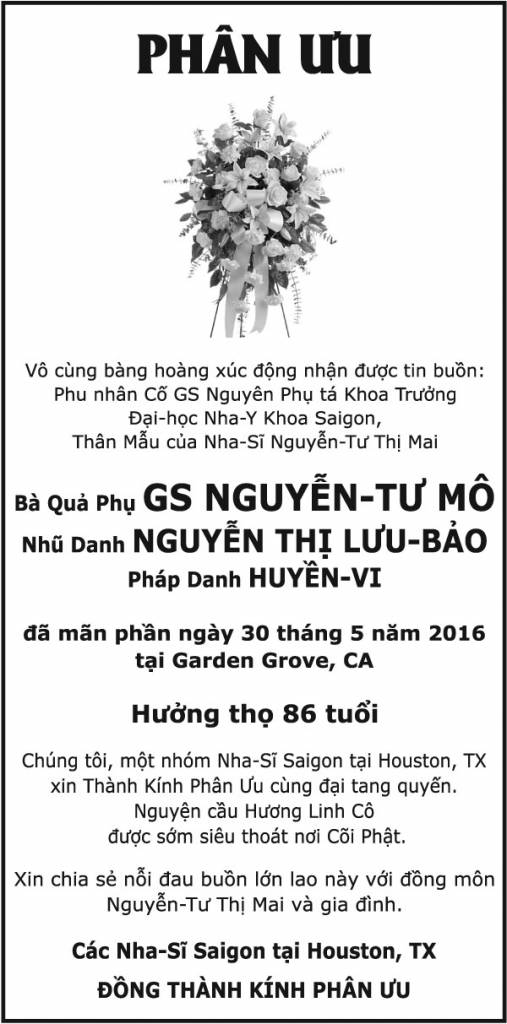 Bà Quả Phụ Nguyễn Tư Mô June 3, 2016 : 7:15 PM TIN LIÊN QUANMORE FROM AUTHOR Bà Lê Thị Như Loan Maria Nguyễn Thị Hồng Tước (3) Maria Nguyễn Thị Hồng Tước (1) Maria Nguyễn Thị Hồng Tước (2) Nhà Địa Lý & Tử Vi Thiên Cơ Ông Phạm Đình Mai Cụ Ông Phạm Đình Mai
