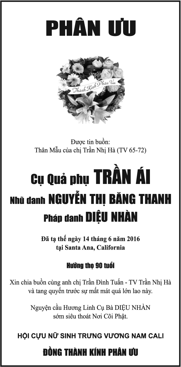 Bà Trần Ái June 20, 2016 : 7:32 PM TIN LIÊN QUANMORE FROM AUTHOR Nhà Địa Lý & Tử Vi Thiên Cơ Ông Phạm Đình Mai Cụ Ông Phạm Đình Mai Cựu Nữ Sinh TV 58-65 Maria Nguyễn Thị Hồng Tước Bà Quả Phụ Trần Đức Thụ (Nhũ Danh Maria Nguyễn Thị Hồng Tước) Bà Trần Thị Sâm Cụ Bà Trần Thị Sâm