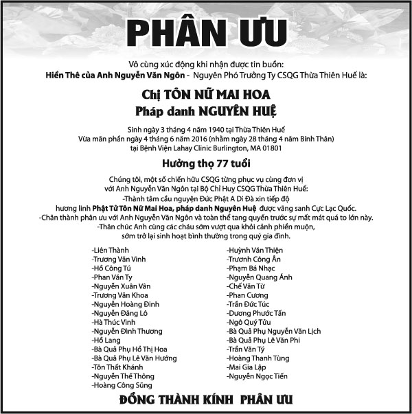 Chị Tôn Nữ Mai Hoa June 5, 2016 : 5:53 PM TIN LIÊN QUANMORE FROM AUTHOR Bà Lê Thị Như Loan Maria Nguyễn Thị Hồng Tước (3) Maria Nguyễn Thị Hồng Tước (1) Maria Nguyễn Thị Hồng Tước (2) Nhà Địa Lý & Tử Vi Thiên Cơ Ông Phạm Đình Mai Cụ Ông Phạm Đình Mai