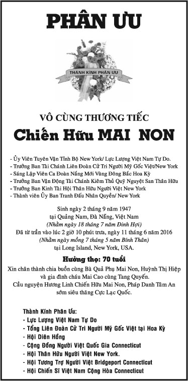Chiến Hữu Mai Non June 17, 2016 : 8:19 PM TIN LIÊN QUANMORE FROM AUTHOR Maria Nguyễn Thị Hồng Tước (3) Maria Nguyễn Thị Hồng Tước (1) Maria Nguyễn Thị Hồng Tước (2) Nhà Địa Lý & Tử Vi Thiên Cơ Ông Phạm Đình Mai Cụ Ông Phạm Đình Mai Cựu Nữ Sinh TV 58-65 Maria Nguyễn Thị Hồng Tước