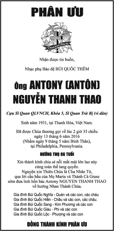 Ông Antony (Antôn) Nguyễn Thanh Thao June 17, 2016 : 8:18 PM TIN LIÊN QUANMORE FROM AUTHOR Maria Nguyễn Thị Hồng Tước (3) Maria Nguyễn Thị Hồng Tước (1) Maria Nguyễn Thị Hồng Tước (2) Nhà Địa Lý & Tử Vi Thiên Cơ Ông Phạm Đình Mai Cụ Ông Phạm Đình Mai Cựu Nữ Sinh TV 58-65 Maria Nguyễn Thị Hồng Tước