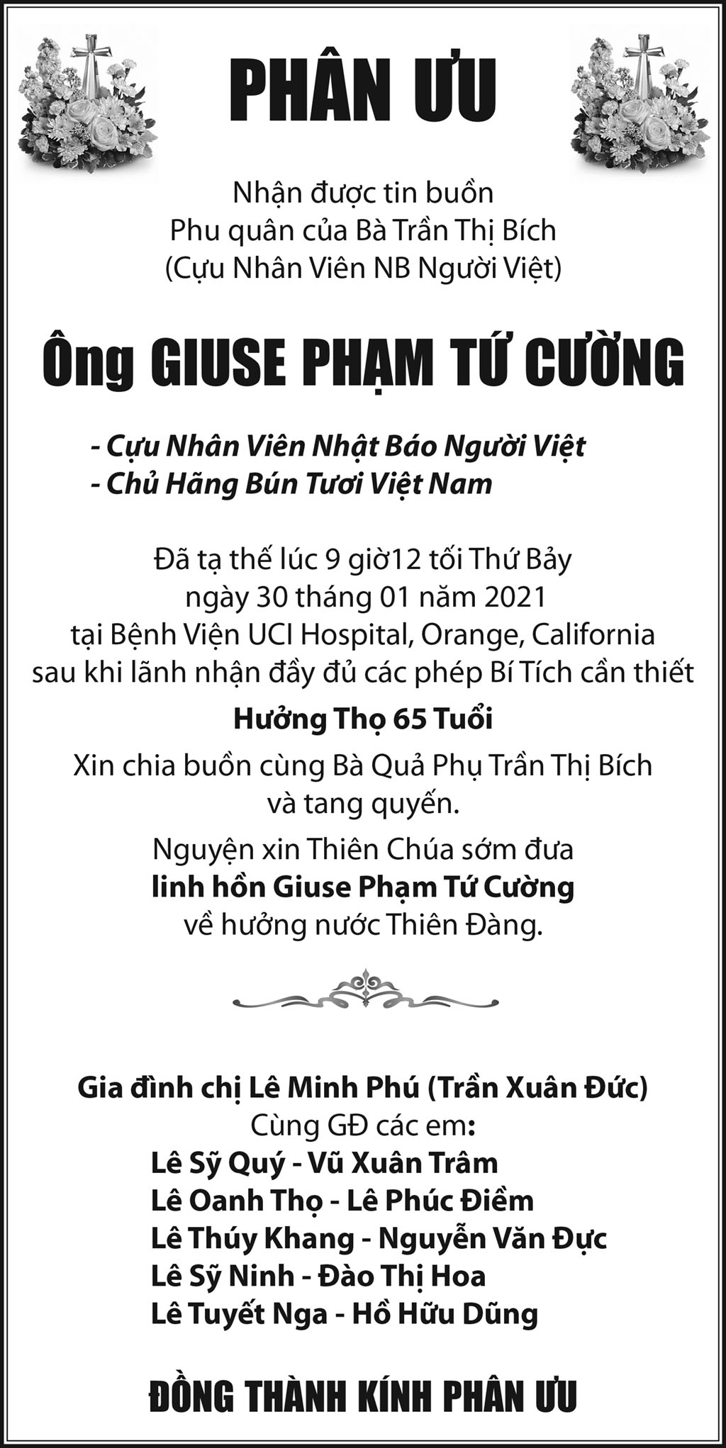 Anh Giuse Phạm Tứ Cường February 19, 2021 : 6:20 PM FacebookXEmailPrint FacebookXEmailPrint CO THE BAN QUAN TAM Bà Trần Thị Sâm April 21, 2026 : 6:15 PM Cụ Bà Trần Thị Sâm April 21, 2026 : 6:13 PM Đồng Chí Nguyễn Hữu Thời April 21, 2026 : 6:05 PM Cụ Ông Nguyễn Hữu Thời April 19, 2026 : 7:12 PM Bác Sĩ Trần Cao Đễ April 17, 2026 : 6:38 PM Chị Đoàn Thị Anh April 17, 2026 : 6:38 PM Ông Đinh Gia Rũng April 16, 2026 : 6:36 PM Cựu Nữ Sinh TV 58-65 Maria Nguyễn Thị Hồng Tước April 15, 2026 : 7:33 PM [disqus_shortcode_codeable] Cáo Phó Ông Vũ Công Thành April 17, 2026 : 6:34 PM Bác Sĩ Trần Cao Để April 17, 2026 : 6:30 PM Cụ Ông Nguyễn Hữu Thời April 17, 2026 : 6:28 PM Ông Đỗ Duy Đức April 17, 2026 : 6:26 PM Cảm Tạ Luật Sư Nguyễn Xuân Nghĩa April 17, 2026 : 6:36 PM Cụ Ông Phạm Văn Khỏe April 2, 2026 : 6:09 PM Bà Nguyễn Thị Thúy Ban March 30, 2026 : 4:08 PM Bà Quả Phụ Lê Khánh March 27, 2026 : 6:17 PM Tưởng Nhớ Huynh Trưởng Du Ca Nguyễn Thiện Cơ January 16, 2026 : 4:54 PM Những buổi tối nơi căn nhà trong hẻm Thành Thái October 19, 2025 : 12:59 PM Doãn Quốc Sỹ, nhà văn, nhà giáo October 19, 2025 : 12:48 PM Nhớ Trưởng Hướng Đạo – Nhà văn Nhật Tiến October 4, 2025 : 5:41 PM Em gái nhạc sĩ Nguyễn Vũ viết về anh trai: Nụ cười hiền hòa... October 2, 2025 : 7:13 PM