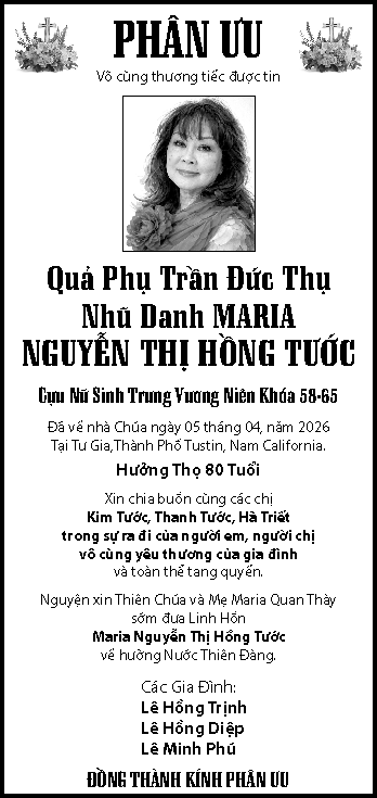 Maria Nguyễn Thị Hồng Tước (2) April 25, 2026 : 7:24 PM FacebookXEmailPrint FacebookXEmailPrint CO THE BAN QUAN TAM Maria Nguyễn Thị Hồng Tước (3) April 25, 2026 : 7:30 PM Maria Nguyễn Thị Hồng Tước (1) April 25, 2026 : 7:26 PM Nhà Địa Lý & Tử Vi Thiên Cơ Ông Phạm Đình Mai April 24, 2026 : 7:27 PM Cụ Ông Phạm Đình Mai April 24, 2026 : 7:26 PM Cựu Nữ Sinh TV 58-65 Maria Nguyễn Thị Hồng Tước April 24, 2026 : 7:24 PM Bà Quả Phụ Trần Đức Thụ (Nhũ Danh Maria Nguyễn Thị Hồng Tước) April 24, 2026 : 7:22 PM Bà Trần Thị Sâm April 21, 2026 : 6:15 PM Cụ Bà Trần Thị Sâm April 21, 2026 : 6:13 PM [disqus_shortcode_codeable] Cáo Phó Phật Tử Phạm Đình Mai April 24, 2026 : 7:16 PM Ông Nguyễn Văn Đước April 24, 2026 : 7:14 PM Bà Lê Thị Như Loan April 24, 2026 : 7:13 PM Ông Nguyễn Công Chương April 24, 2026 : 7:08 PM Cảm Tạ Luật Sư Nguyễn Xuân Nghĩa April 17, 2026 : 6:36 PM Cụ Ông Phạm Văn Khỏe April 2, 2026 : 6:09 PM Bà Nguyễn Thị Thúy Ban March 30, 2026 : 4:08 PM Bà Quả Phụ Lê Khánh March 27, 2026 : 6:17 PM Tưởng Nhớ Ca sĩ Hồng Tước April 25, 2026 : 2:00 PM Huynh Trưởng Du Ca Nguyễn Thiện Cơ January 16, 2026 : 4:54 PM Những buổi tối nơi căn nhà trong hẻm Thành Thái October 19, 2025 : 12:59 PM Doãn Quốc Sỹ, nhà văn, nhà giáo October 19, 2025 : 12:48 PM Nhớ Trưởng Hướng Đạo – Nhà văn Nhật Tiến October 4, 2025 : 5:41 PM