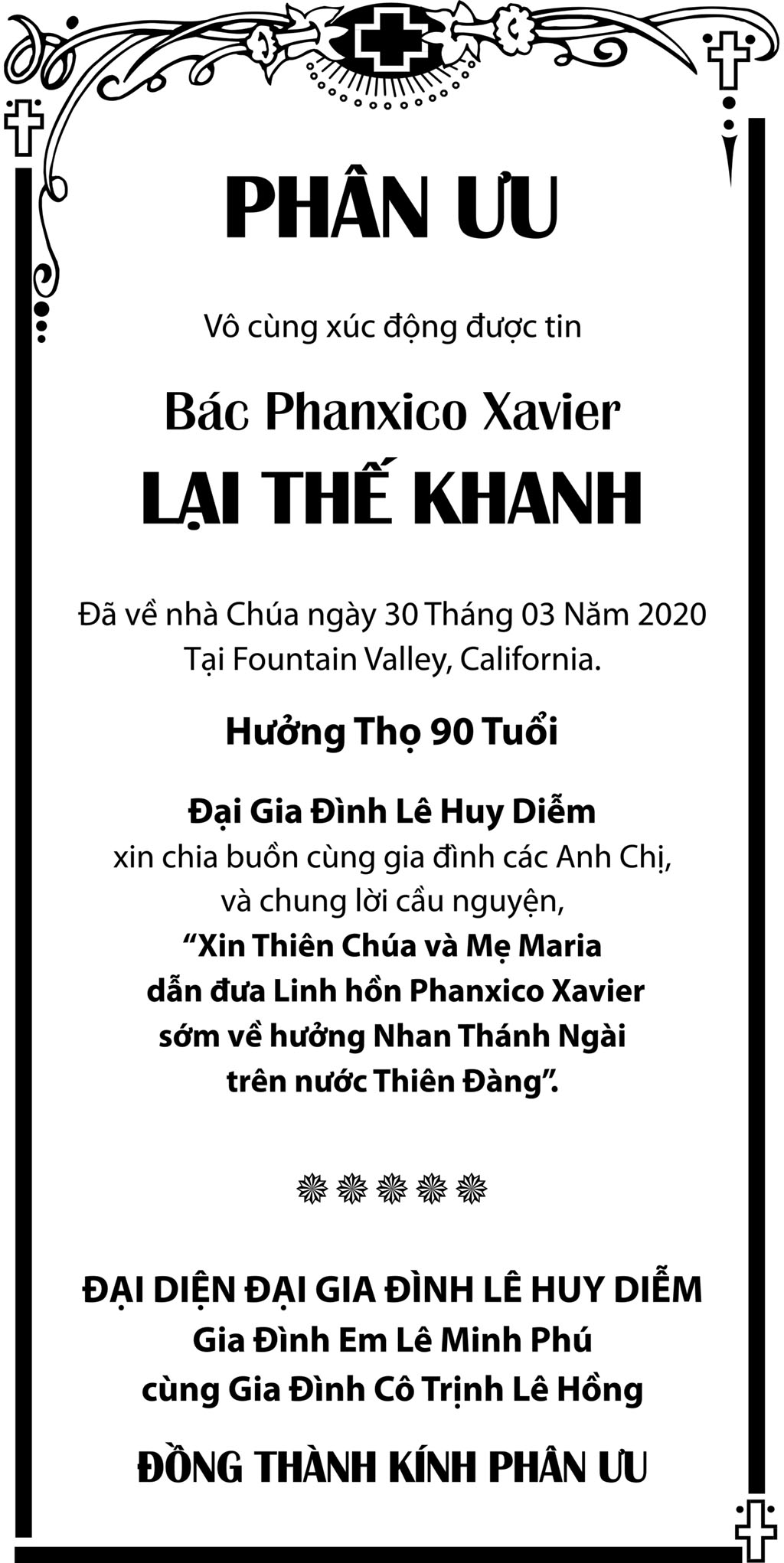 Bác Phanxico Xavier Lại Thế Khanh April 2, 2020 : 4:45 PM FacebookXEmailPrint FacebookXEmailPrint CO THE BAN QUAN TAM Bà Trần Thị Sâm April 21, 2026 : 6:15 PM Cụ Bà Trần Thị Sâm April 21, 2026 : 6:13 PM Đồng Chí Nguyễn Hữu Thời April 21, 2026 : 6:05 PM Cụ Ông Nguyễn Hữu Thời April 19, 2026 : 7:12 PM Bác Sĩ Trần Cao Đễ April 17, 2026 : 6:38 PM Chị Đoàn Thị Anh April 17, 2026 : 6:38 PM Ông Đinh Gia Rũng April 16, 2026 : 6:36 PM Cựu Nữ Sinh TV 58-65 Maria Nguyễn Thị Hồng Tước April 15, 2026 : 7:33 PM [disqus_shortcode_codeable] Cáo Phó Ông Vũ Công Thành April 17, 2026 : 6:34 PM Bác Sĩ Trần Cao Để April 17, 2026 : 6:30 PM Cụ Ông Nguyễn Hữu Thời April 17, 2026 : 6:28 PM Ông Đỗ Duy Đức April 17, 2026 : 6:26 PM Cảm Tạ Luật Sư Nguyễn Xuân Nghĩa April 17, 2026 : 6:36 PM Cụ Ông Phạm Văn Khỏe April 2, 2026 : 6:09 PM Bà Nguyễn Thị Thúy Ban March 30, 2026 : 4:08 PM Bà Quả Phụ Lê Khánh March 27, 2026 : 6:17 PM Tưởng Nhớ Huynh Trưởng Du Ca Nguyễn Thiện Cơ January 16, 2026 : 4:54 PM Những buổi tối nơi căn nhà trong hẻm Thành Thái October 19, 2025 : 12:59 PM Doãn Quốc Sỹ, nhà văn, nhà giáo October 19, 2025 : 12:48 PM Nhớ Trưởng Hướng Đạo – Nhà văn Nhật Tiến October 4, 2025 : 5:41 PM Em gái nhạc sĩ Nguyễn Vũ viết về anh trai: Nụ cười hiền hòa... October 2, 2025 : 7:13 PM