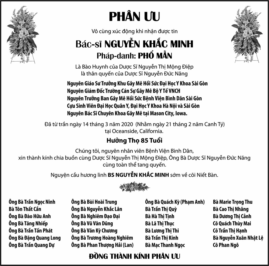 Bác Sĩ Nguyễn Khắc Minh April 1, 2020 : 6:39 PM FacebookXEmailPrint FacebookXEmailPrint CO THE BAN QUAN TAM Bà Trần Thị Sâm April 21, 2026 : 6:15 PM Cụ Bà Trần Thị Sâm April 21, 2026 : 6:13 PM Đồng Chí Nguyễn Hữu Thời April 21, 2026 : 6:05 PM Cụ Ông Nguyễn Hữu Thời April 19, 2026 : 7:12 PM Bác Sĩ Trần Cao Đễ April 17, 2026 : 6:38 PM Chị Đoàn Thị Anh April 17, 2026 : 6:38 PM Ông Đinh Gia Rũng April 16, 2026 : 6:36 PM Cựu Nữ Sinh TV 58-65 Maria Nguyễn Thị Hồng Tước April 15, 2026 : 7:33 PM [disqus_shortcode_codeable] Cáo Phó Ông Vũ Công Thành April 17, 2026 : 6:34 PM Bác Sĩ Trần Cao Để April 17, 2026 : 6:30 PM Cụ Ông Nguyễn Hữu Thời April 17, 2026 : 6:28 PM Ông Đỗ Duy Đức April 17, 2026 : 6:26 PM Cảm Tạ Luật Sư Nguyễn Xuân Nghĩa April 17, 2026 : 6:36 PM Cụ Ông Phạm Văn Khỏe April 2, 2026 : 6:09 PM Bà Nguyễn Thị Thúy Ban March 30, 2026 : 4:08 PM Bà Quả Phụ Lê Khánh March 27, 2026 : 6:17 PM Tưởng Nhớ Huynh Trưởng Du Ca Nguyễn Thiện Cơ January 16, 2026 : 4:54 PM Những buổi tối nơi căn nhà trong hẻm Thành Thái October 19, 2025 : 12:59 PM Doãn Quốc Sỹ, nhà văn, nhà giáo October 19, 2025 : 12:48 PM Nhớ Trưởng Hướng Đạo – Nhà văn Nhật Tiến October 4, 2025 : 5:41 PM Em gái nhạc sĩ Nguyễn Vũ viết về anh trai: Nụ cười hiền hòa... October 2, 2025 : 7:13 PM