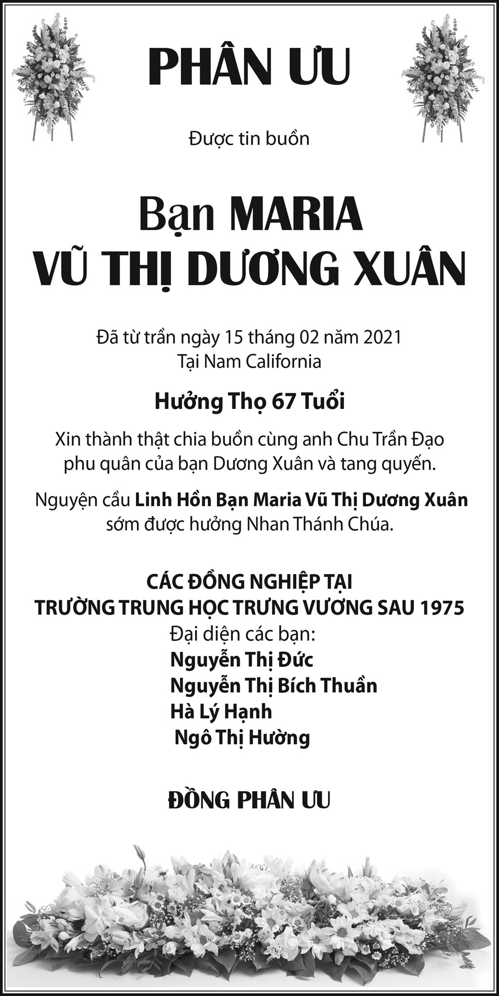 Bạn Maria Vũ Thị Dương Xuân February 22, 2021 : 4:09 PM FacebookXEmailPrint FacebookXEmailPrint CO THE BAN QUAN TAM Bà Trần Thị Sâm April 21, 2026 : 6:15 PM Cụ Bà Trần Thị Sâm April 21, 2026 : 6:13 PM Đồng Chí Nguyễn Hữu Thời April 21, 2026 : 6:05 PM Cụ Ông Nguyễn Hữu Thời April 19, 2026 : 7:12 PM Bác Sĩ Trần Cao Đễ April 17, 2026 : 6:38 PM Chị Đoàn Thị Anh April 17, 2026 : 6:38 PM Ông Đinh Gia Rũng April 16, 2026 : 6:36 PM Cựu Nữ Sinh TV 58-65 Maria Nguyễn Thị Hồng Tước April 15, 2026 : 7:33 PM [disqus_shortcode_codeable] Cáo Phó Ông Vũ Công Thành April 17, 2026 : 6:34 PM Bác Sĩ Trần Cao Để April 17, 2026 : 6:30 PM Cụ Ông Nguyễn Hữu Thời April 17, 2026 : 6:28 PM Ông Đỗ Duy Đức April 17, 2026 : 6:26 PM Cảm Tạ Luật Sư Nguyễn Xuân Nghĩa April 17, 2026 : 6:36 PM Cụ Ông Phạm Văn Khỏe April 2, 2026 : 6:09 PM Bà Nguyễn Thị Thúy Ban March 30, 2026 : 4:08 PM Bà Quả Phụ Lê Khánh March 27, 2026 : 6:17 PM Tưởng Nhớ Huynh Trưởng Du Ca Nguyễn Thiện Cơ January 16, 2026 : 4:54 PM Những buổi tối nơi căn nhà trong hẻm Thành Thái October 19, 2025 : 12:59 PM Doãn Quốc Sỹ, nhà văn, nhà giáo October 19, 2025 : 12:48 PM Nhớ Trưởng Hướng Đạo – Nhà văn Nhật Tiến October 4, 2025 : 5:41 PM Em gái nhạc sĩ Nguyễn Vũ viết về anh trai: Nụ cười hiền hòa... October 2, 2025 : 7:13 PM