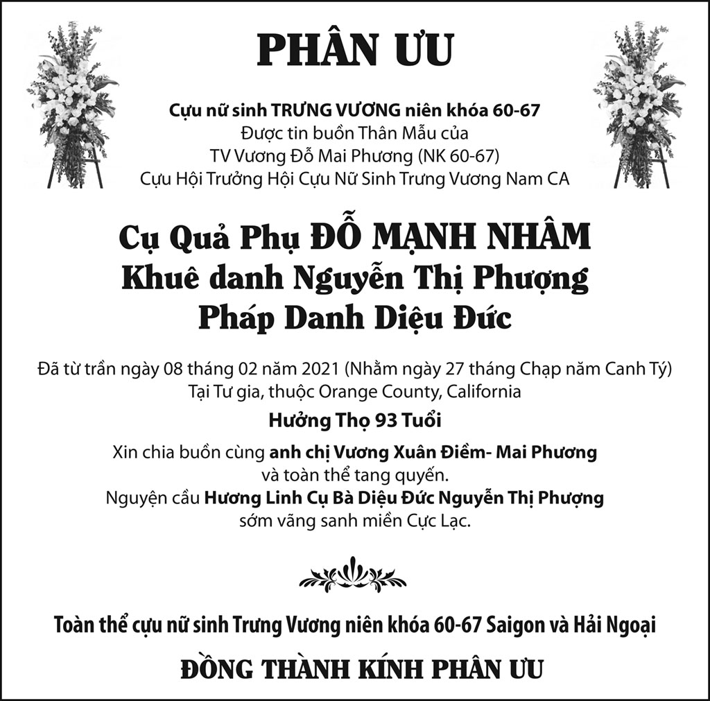Cụ Quả Phụ Đỗ Mạnh Nhâm February 19, 2021 : 6:03 PM FacebookXEmailPrint FacebookXEmailPrint CO THE BAN QUAN TAM Bà Trần Thị Sâm April 21, 2026 : 6:15 PM Cụ Bà Trần Thị Sâm April 21, 2026 : 6:13 PM Đồng Chí Nguyễn Hữu Thời April 21, 2026 : 6:05 PM Cụ Ông Nguyễn Hữu Thời April 19, 2026 : 7:12 PM Bác Sĩ Trần Cao Đễ April 17, 2026 : 6:38 PM Chị Đoàn Thị Anh April 17, 2026 : 6:38 PM Ông Đinh Gia Rũng April 16, 2026 : 6:36 PM Cựu Nữ Sinh TV 58-65 Maria Nguyễn Thị Hồng Tước April 15, 2026 : 7:33 PM [disqus_shortcode_codeable] Cáo Phó Ông Vũ Công Thành April 17, 2026 : 6:34 PM Bác Sĩ Trần Cao Để April 17, 2026 : 6:30 PM Cụ Ông Nguyễn Hữu Thời April 17, 2026 : 6:28 PM Ông Đỗ Duy Đức April 17, 2026 : 6:26 PM Cảm Tạ Luật Sư Nguyễn Xuân Nghĩa April 17, 2026 : 6:36 PM Cụ Ông Phạm Văn Khỏe April 2, 2026 : 6:09 PM Bà Nguyễn Thị Thúy Ban March 30, 2026 : 4:08 PM Bà Quả Phụ Lê Khánh March 27, 2026 : 6:17 PM Tưởng Nhớ Huynh Trưởng Du Ca Nguyễn Thiện Cơ January 16, 2026 : 4:54 PM Những buổi tối nơi căn nhà trong hẻm Thành Thái October 19, 2025 : 12:59 PM Doãn Quốc Sỹ, nhà văn, nhà giáo October 19, 2025 : 12:48 PM Nhớ Trưởng Hướng Đạo – Nhà văn Nhật Tiến October 4, 2025 : 5:41 PM Em gái nhạc sĩ Nguyễn Vũ viết về anh trai: Nụ cười hiền hòa... October 2, 2025 : 7:13 PM