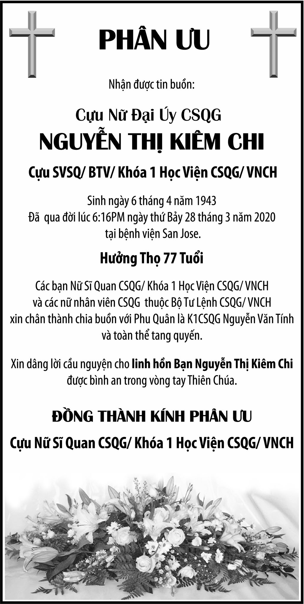 Cựu Nữ Đại Úy CSQG Nguyễn Thị Kiêm Chi March 31, 2020 : 4:30 PM FacebookXEmailPrint FacebookXEmailPrint CO THE BAN QUAN TAM Bà Trần Thị Sâm April 21, 2026 : 6:15 PM Cụ Bà Trần Thị Sâm April 21, 2026 : 6:13 PM Đồng Chí Nguyễn Hữu Thời April 21, 2026 : 6:05 PM Cụ Ông Nguyễn Hữu Thời April 19, 2026 : 7:12 PM Bác Sĩ Trần Cao Đễ April 17, 2026 : 6:38 PM Chị Đoàn Thị Anh April 17, 2026 : 6:38 PM Ông Đinh Gia Rũng April 16, 2026 : 6:36 PM Cựu Nữ Sinh TV 58-65 Maria Nguyễn Thị Hồng Tước April 15, 2026 : 7:33 PM [disqus_shortcode_codeable] Cáo Phó Ông Vũ Công Thành April 17, 2026 : 6:34 PM Bác Sĩ Trần Cao Để April 17, 2026 : 6:30 PM Cụ Ông Nguyễn Hữu Thời April 17, 2026 : 6:28 PM Ông Đỗ Duy Đức April 17, 2026 : 6:26 PM Cảm Tạ Luật Sư Nguyễn Xuân Nghĩa April 17, 2026 : 6:36 PM Cụ Ông Phạm Văn Khỏe April 2, 2026 : 6:09 PM Bà Nguyễn Thị Thúy Ban March 30, 2026 : 4:08 PM Bà Quả Phụ Lê Khánh March 27, 2026 : 6:17 PM Tưởng Nhớ Huynh Trưởng Du Ca Nguyễn Thiện Cơ January 16, 2026 : 4:54 PM Những buổi tối nơi căn nhà trong hẻm Thành Thái October 19, 2025 : 12:59 PM Doãn Quốc Sỹ, nhà văn, nhà giáo October 19, 2025 : 12:48 PM Nhớ Trưởng Hướng Đạo – Nhà văn Nhật Tiến October 4, 2025 : 5:41 PM Em gái nhạc sĩ Nguyễn Vũ viết về anh trai: Nụ cười hiền hòa... October 2, 2025 : 7:13 PM