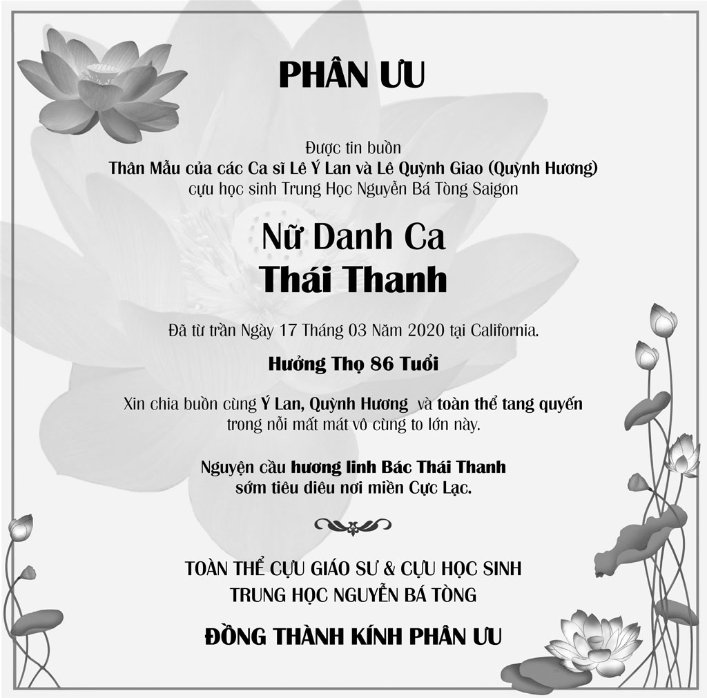 Nữ Danh Ca Thái Thanh March 26, 2020 : 5:23 PM FacebookXEmailPrint FacebookXEmailPrint CO THE BAN QUAN TAM Bà Trần Thị Sâm April 21, 2026 : 6:15 PM Cụ Bà Trần Thị Sâm April 21, 2026 : 6:13 PM Đồng Chí Nguyễn Hữu Thời April 21, 2026 : 6:05 PM Cụ Ông Nguyễn Hữu Thời April 19, 2026 : 7:12 PM Bác Sĩ Trần Cao Đễ April 17, 2026 : 6:38 PM Chị Đoàn Thị Anh April 17, 2026 : 6:38 PM Ông Đinh Gia Rũng April 16, 2026 : 6:36 PM Cựu Nữ Sinh TV 58-65 Maria Nguyễn Thị Hồng Tước April 15, 2026 : 7:33 PM [disqus_shortcode_codeable] Cáo Phó Ông Vũ Công Thành April 17, 2026 : 6:34 PM Bác Sĩ Trần Cao Để April 17, 2026 : 6:30 PM Cụ Ông Nguyễn Hữu Thời April 17, 2026 : 6:28 PM Ông Đỗ Duy Đức April 17, 2026 : 6:26 PM Cảm Tạ Luật Sư Nguyễn Xuân Nghĩa April 17, 2026 : 6:36 PM Cụ Ông Phạm Văn Khỏe April 2, 2026 : 6:09 PM Bà Nguyễn Thị Thúy Ban March 30, 2026 : 4:08 PM Bà Quả Phụ Lê Khánh March 27, 2026 : 6:17 PM Tưởng Nhớ Huynh Trưởng Du Ca Nguyễn Thiện Cơ January 16, 2026 : 4:54 PM Những buổi tối nơi căn nhà trong hẻm Thành Thái October 19, 2025 : 12:59 PM Doãn Quốc Sỹ, nhà văn, nhà giáo October 19, 2025 : 12:48 PM Nhớ Trưởng Hướng Đạo – Nhà văn Nhật Tiến October 4, 2025 : 5:41 PM Em gái nhạc sĩ Nguyễn Vũ viết về anh trai: Nụ cười hiền hòa... October 2, 2025 : 7:13 PM
