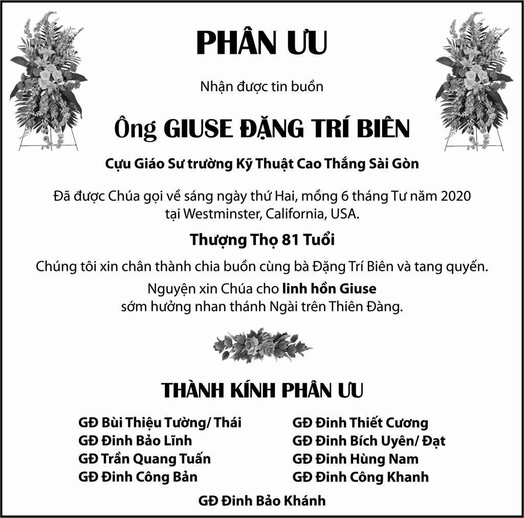 Ông Giuse Đặng Trí Biên April 7, 2020 : 3:38 PM FacebookXEmailPrint FacebookXEmailPrint CO THE BAN QUAN TAM Bà Trần Thị Sâm April 21, 2026 : 6:15 PM Cụ Bà Trần Thị Sâm April 21, 2026 : 6:13 PM Đồng Chí Nguyễn Hữu Thời April 21, 2026 : 6:05 PM Cụ Ông Nguyễn Hữu Thời April 19, 2026 : 7:12 PM Bác Sĩ Trần Cao Đễ April 17, 2026 : 6:38 PM Chị Đoàn Thị Anh April 17, 2026 : 6:38 PM Ông Đinh Gia Rũng April 16, 2026 : 6:36 PM Cựu Nữ Sinh TV 58-65 Maria Nguyễn Thị Hồng Tước April 15, 2026 : 7:33 PM [disqus_shortcode_codeable] Cáo Phó Ông Vũ Công Thành April 17, 2026 : 6:34 PM Bác Sĩ Trần Cao Để April 17, 2026 : 6:30 PM Cụ Ông Nguyễn Hữu Thời April 17, 2026 : 6:28 PM Ông Đỗ Duy Đức April 17, 2026 : 6:26 PM Cảm Tạ Luật Sư Nguyễn Xuân Nghĩa April 17, 2026 : 6:36 PM Cụ Ông Phạm Văn Khỏe April 2, 2026 : 6:09 PM Bà Nguyễn Thị Thúy Ban March 30, 2026 : 4:08 PM Bà Quả Phụ Lê Khánh March 27, 2026 : 6:17 PM Tưởng Nhớ Huynh Trưởng Du Ca Nguyễn Thiện Cơ January 16, 2026 : 4:54 PM Những buổi tối nơi căn nhà trong hẻm Thành Thái October 19, 2025 : 12:59 PM Doãn Quốc Sỹ, nhà văn, nhà giáo October 19, 2025 : 12:48 PM Nhớ Trưởng Hướng Đạo – Nhà văn Nhật Tiến October 4, 2025 : 5:41 PM Em gái nhạc sĩ Nguyễn Vũ viết về anh trai: Nụ cười hiền hòa... October 2, 2025 : 7:13 PM