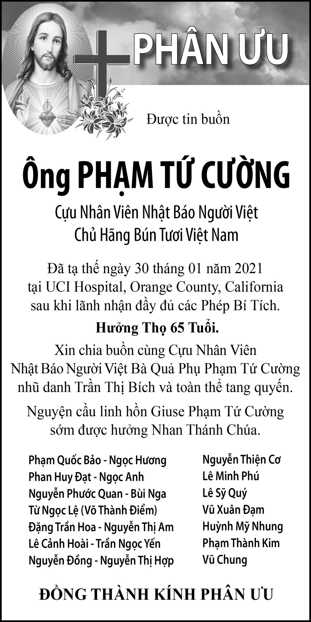 Ông Phạm Tứ Cường February 19, 2021 : 6:22 PM FacebookXEmailPrint FacebookXEmailPrint CO THE BAN QUAN TAM Bà Trần Thị Sâm April 21, 2026 : 6:15 PM Cụ Bà Trần Thị Sâm April 21, 2026 : 6:13 PM Đồng Chí Nguyễn Hữu Thời April 21, 2026 : 6:05 PM Cụ Ông Nguyễn Hữu Thời April 19, 2026 : 7:12 PM Bác Sĩ Trần Cao Đễ April 17, 2026 : 6:38 PM Chị Đoàn Thị Anh April 17, 2026 : 6:38 PM Ông Đinh Gia Rũng April 16, 2026 : 6:36 PM Cựu Nữ Sinh TV 58-65 Maria Nguyễn Thị Hồng Tước April 15, 2026 : 7:33 PM [disqus_shortcode_codeable] Cáo Phó Ông Vũ Công Thành April 17, 2026 : 6:34 PM Bác Sĩ Trần Cao Để April 17, 2026 : 6:30 PM Cụ Ông Nguyễn Hữu Thời April 17, 2026 : 6:28 PM Ông Đỗ Duy Đức April 17, 2026 : 6:26 PM Cảm Tạ Luật Sư Nguyễn Xuân Nghĩa April 17, 2026 : 6:36 PM Cụ Ông Phạm Văn Khỏe April 2, 2026 : 6:09 PM Bà Nguyễn Thị Thúy Ban March 30, 2026 : 4:08 PM Bà Quả Phụ Lê Khánh March 27, 2026 : 6:17 PM Tưởng Nhớ Huynh Trưởng Du Ca Nguyễn Thiện Cơ January 16, 2026 : 4:54 PM Những buổi tối nơi căn nhà trong hẻm Thành Thái October 19, 2025 : 12:59 PM Doãn Quốc Sỹ, nhà văn, nhà giáo October 19, 2025 : 12:48 PM Nhớ Trưởng Hướng Đạo – Nhà văn Nhật Tiến October 4, 2025 : 5:41 PM Em gái nhạc sĩ Nguyễn Vũ viết về anh trai: Nụ cười hiền hòa... October 2, 2025 : 7:13 PM
