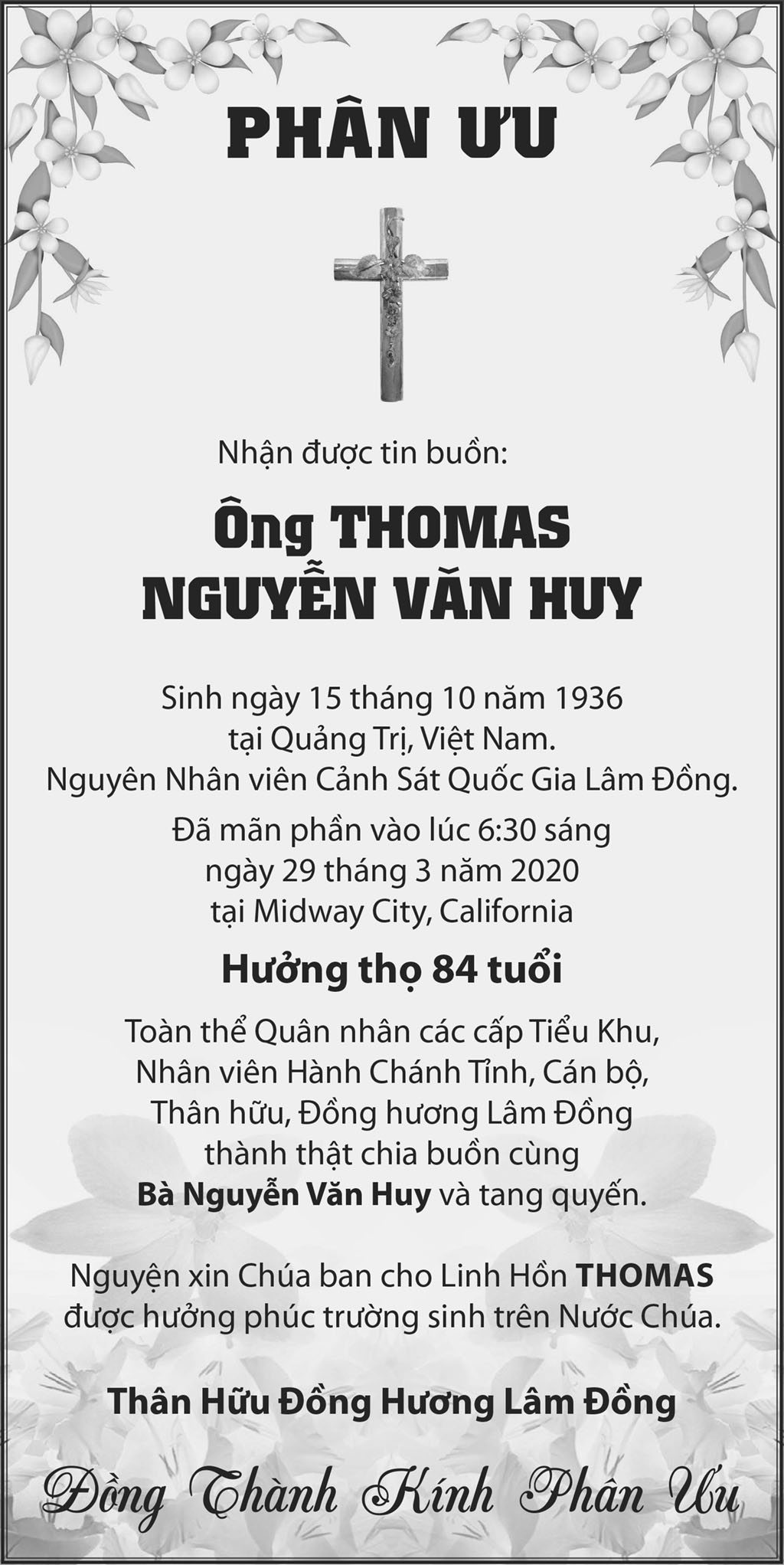 Ông Thomas Nguyễn Văn Huy March 30, 2020 : 5:50 PM FacebookXEmailPrint FacebookXEmailPrint CO THE BAN QUAN TAM Bà Trần Thị Sâm April 21, 2026 : 6:15 PM Cụ Bà Trần Thị Sâm April 21, 2026 : 6:13 PM Đồng Chí Nguyễn Hữu Thời April 21, 2026 : 6:05 PM Cụ Ông Nguyễn Hữu Thời April 19, 2026 : 7:12 PM Bác Sĩ Trần Cao Đễ April 17, 2026 : 6:38 PM Chị Đoàn Thị Anh April 17, 2026 : 6:38 PM Ông Đinh Gia Rũng April 16, 2026 : 6:36 PM Cựu Nữ Sinh TV 58-65 Maria Nguyễn Thị Hồng Tước April 15, 2026 : 7:33 PM [disqus_shortcode_codeable] Cáo Phó Ông Vũ Công Thành April 17, 2026 : 6:34 PM Bác Sĩ Trần Cao Để April 17, 2026 : 6:30 PM Cụ Ông Nguyễn Hữu Thời April 17, 2026 : 6:28 PM Ông Đỗ Duy Đức April 17, 2026 : 6:26 PM Cảm Tạ Luật Sư Nguyễn Xuân Nghĩa April 17, 2026 : 6:36 PM Cụ Ông Phạm Văn Khỏe April 2, 2026 : 6:09 PM Bà Nguyễn Thị Thúy Ban March 30, 2026 : 4:08 PM Bà Quả Phụ Lê Khánh March 27, 2026 : 6:17 PM Tưởng Nhớ Huynh Trưởng Du Ca Nguyễn Thiện Cơ January 16, 2026 : 4:54 PM Những buổi tối nơi căn nhà trong hẻm Thành Thái October 19, 2025 : 12:59 PM Doãn Quốc Sỹ, nhà văn, nhà giáo October 19, 2025 : 12:48 PM Nhớ Trưởng Hướng Đạo – Nhà văn Nhật Tiến October 4, 2025 : 5:41 PM Em gái nhạc sĩ Nguyễn Vũ viết về anh trai: Nụ cười hiền hòa... October 2, 2025 : 7:13 PM