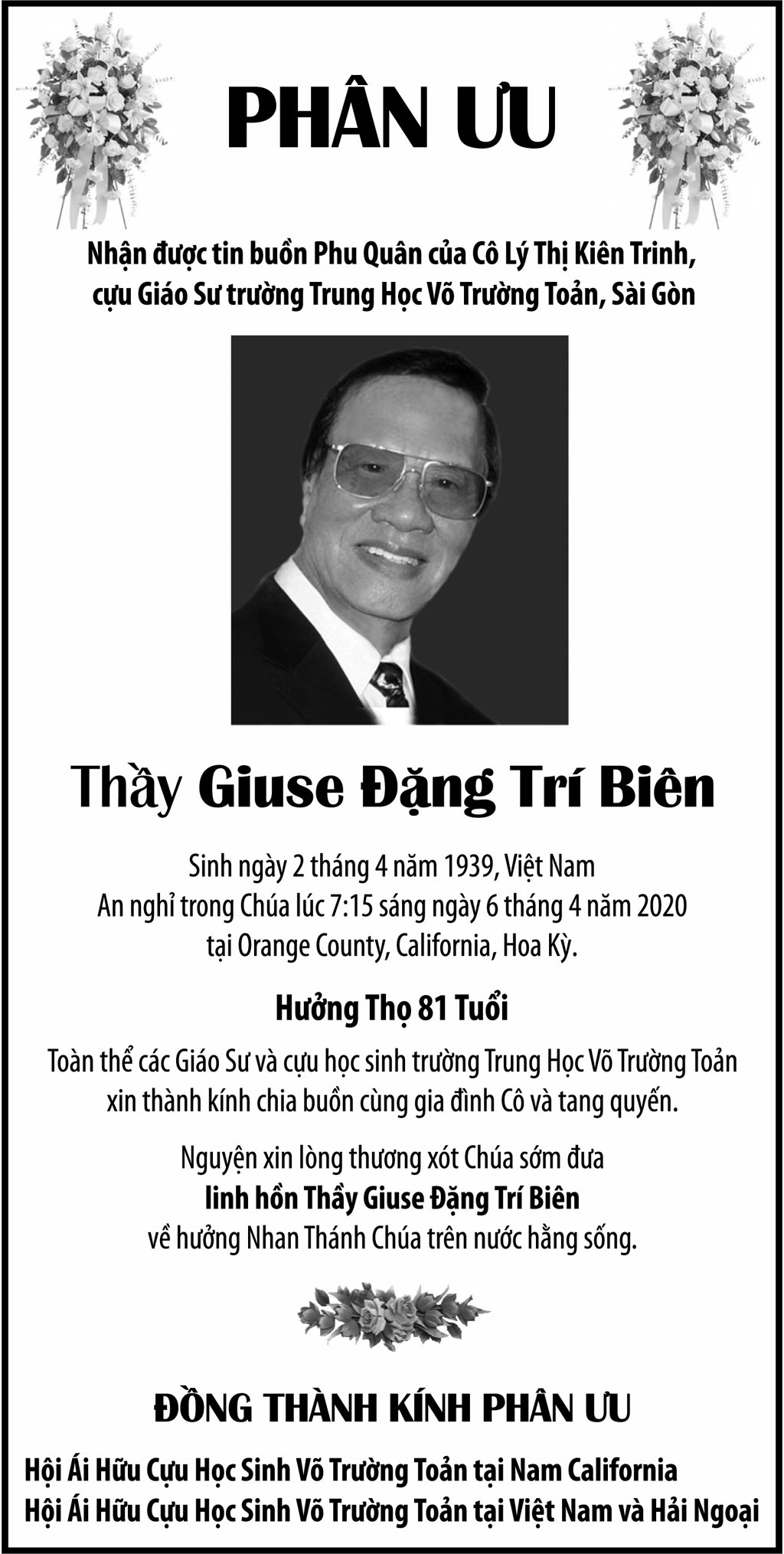Thầy Giuse Đặng Trí Biên April 8, 2020 : 4:15 PM FacebookXEmailPrint FacebookXEmailPrint CO THE BAN QUAN TAM Bà Trần Thị Sâm April 21, 2026 : 6:15 PM Cụ Bà Trần Thị Sâm April 21, 2026 : 6:13 PM Đồng Chí Nguyễn Hữu Thời April 21, 2026 : 6:05 PM Cụ Ông Nguyễn Hữu Thời April 19, 2026 : 7:12 PM Bác Sĩ Trần Cao Đễ April 17, 2026 : 6:38 PM Chị Đoàn Thị Anh April 17, 2026 : 6:38 PM Ông Đinh Gia Rũng April 16, 2026 : 6:36 PM Cựu Nữ Sinh TV 58-65 Maria Nguyễn Thị Hồng Tước April 15, 2026 : 7:33 PM [disqus_shortcode_codeable] Cáo Phó Ông Vũ Công Thành April 17, 2026 : 6:34 PM Bác Sĩ Trần Cao Để April 17, 2026 : 6:30 PM Cụ Ông Nguyễn Hữu Thời April 17, 2026 : 6:28 PM Ông Đỗ Duy Đức April 17, 2026 : 6:26 PM Cảm Tạ Luật Sư Nguyễn Xuân Nghĩa April 17, 2026 : 6:36 PM Cụ Ông Phạm Văn Khỏe April 2, 2026 : 6:09 PM Bà Nguyễn Thị Thúy Ban March 30, 2026 : 4:08 PM Bà Quả Phụ Lê Khánh March 27, 2026 : 6:17 PM Tưởng Nhớ Huynh Trưởng Du Ca Nguyễn Thiện Cơ January 16, 2026 : 4:54 PM Những buổi tối nơi căn nhà trong hẻm Thành Thái October 19, 2025 : 12:59 PM Doãn Quốc Sỹ, nhà văn, nhà giáo October 19, 2025 : 12:48 PM Nhớ Trưởng Hướng Đạo – Nhà văn Nhật Tiến October 4, 2025 : 5:41 PM Em gái nhạc sĩ Nguyễn Vũ viết về anh trai: Nụ cười hiền hòa... October 2, 2025 : 7:13 PM