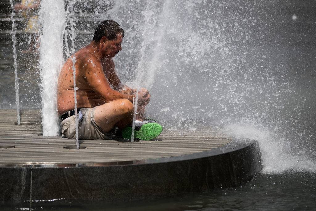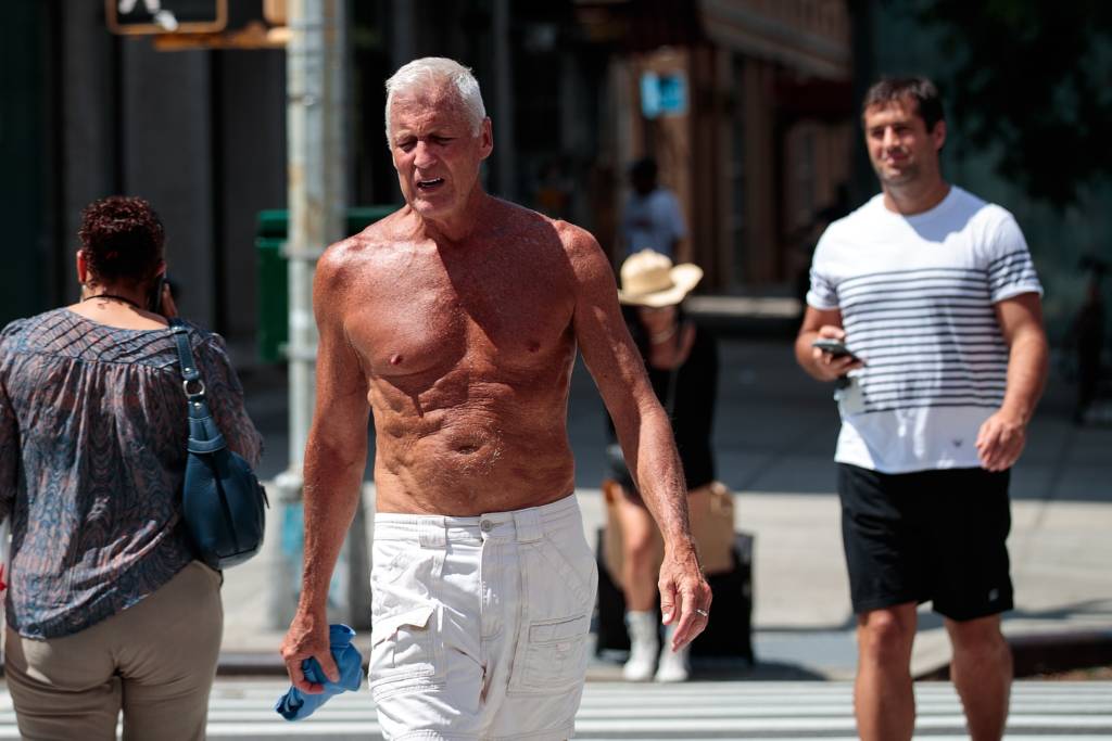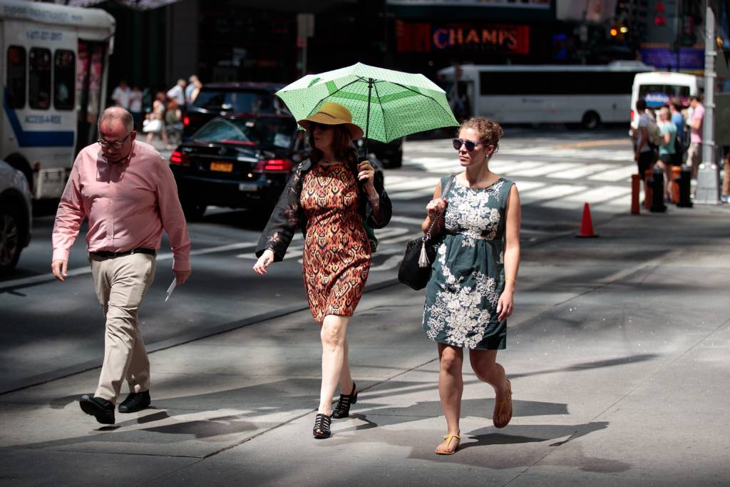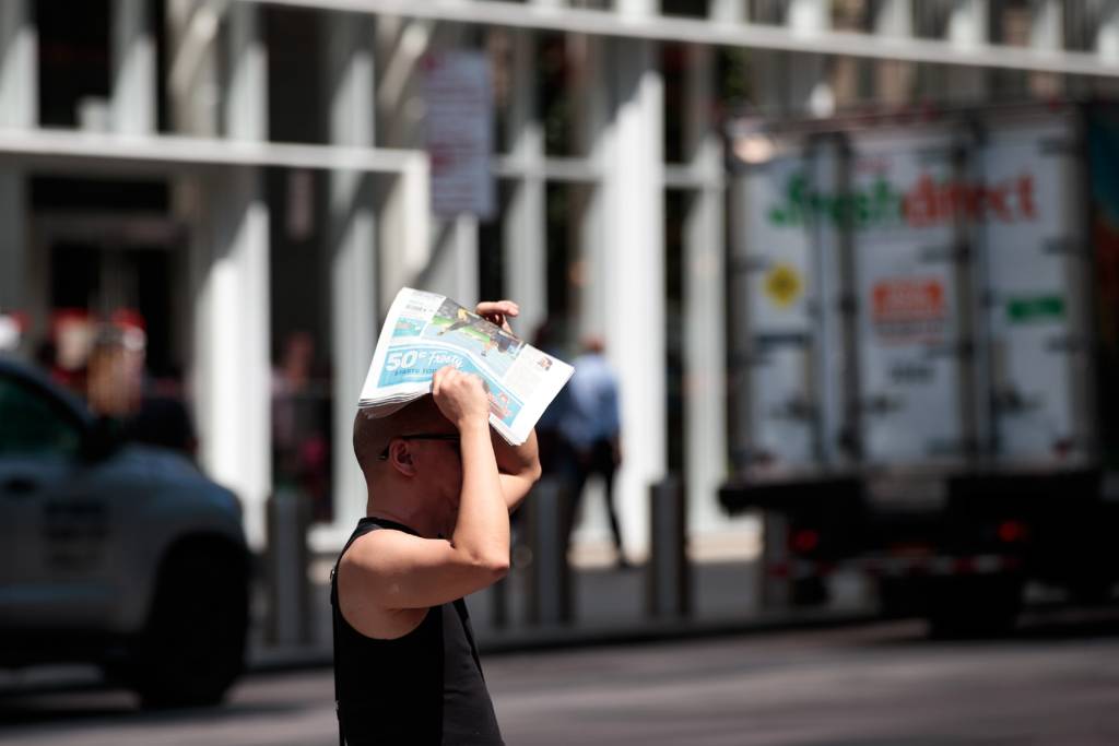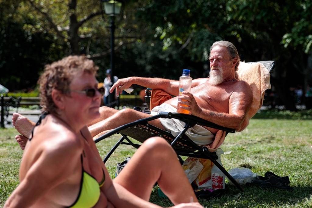 Che dù có che được cái nóng 100 độ F của New York không? Đại lộ 42 gần Times Square, New York City, 15 tháng Tám. (Hình: Drew Angerer/Getty Images)Đường 23, khu phố Chelsea, New York City. (Hình: Drew Angerer/Getty Images)Có phải là cách thông minh nhất: Ngồi luôn vào hồ nước công viên Washington Square Park. (Hình: Drew Angerer/Getty Images)Nóng, và tắm nắng luôn cho tiện: Ông Ronnie Rossi, cư dân New York tại Washington Square Park, 15 tháng Tám. (Hình: Drew Angerer/Getty Images)Che đỡ tờ báo cho đỡ nắng. Đường 42, gần Bryant Park, New York City, 15 tháng Tám. (Hình: Drew Angerer/Getty Images)