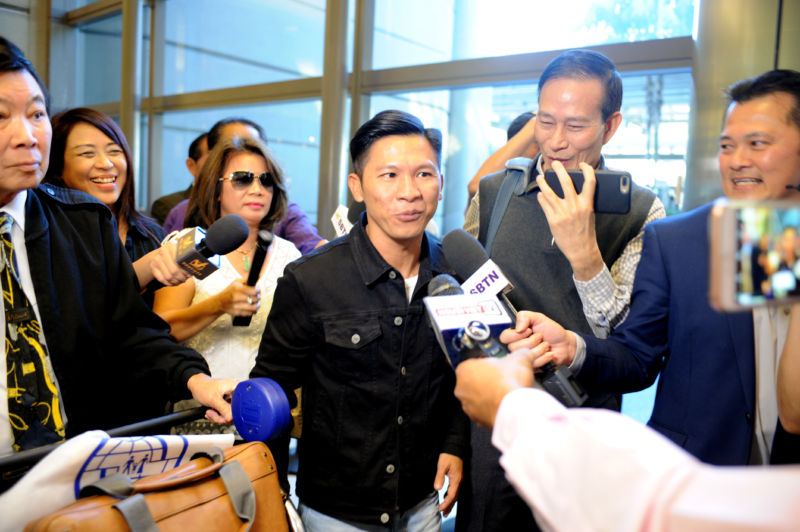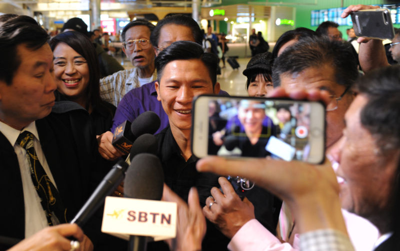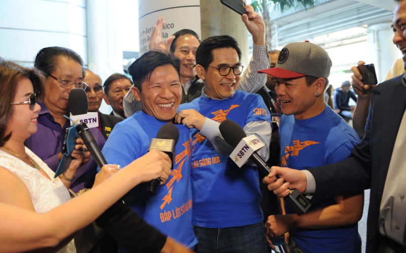 Nhạc sĩ Việt Khang, cựu tù nhân lương tâm và là tác giả các bài hát nổi tiếng như “Anh Là Ai,” “Việt Nam Tôi Đâu,” “Trả Lại Cho Dân,” vừa đến phi trường Los Angeles, California, lúc 1 giờ 20 phút chiều Thứ Năm, 8 Tháng Hai, và được đông đảo đồng hương và giới truyền thông ra đón.“Trước hết, Việt Khang xin cảm ơn tất cả mọi người ra đón. Nhờ sự đoàn kết của đồng hương mà Việt Khang đến được nơi đây,” nhạc sĩ Việt Khang nói, ngay khi vừa đẩy xe hành lý ra khỏi khu vực chính của Tom Bradley International Terminal.Theo bản tin của đài truyền hình SBTN, “Việc nhạc sĩ Việt Khang được sang định cư tại Hoa Kỳ là kết quả của một quá trình can thiệp lâu dài của chính quyền Mỹ và nhiều tổ chức quốc tế đối với chính quyền CSVN, trong đó, đặc biệt phải nhắc đến Thượng Nghị Sĩ John McCain, người đã trực tiếp can thiệp, nêu trường hợp của nhạc sĩ này với chính phủ Hoa Kỳ khi làm việc với CSVN.”Nhạc sĩ Việt Khang cảm động khi thấy nhạc sĩ Trúc Hồ, tổng giám đốc đài SBTN, người mà anh gọi là người anh. ca sĩ Nguyên Khang đã tặng chiếc áo Đáp Lời Sông Núi cho Việt Khang.Gặp lại người anh, người bạn tù Điếu Cày lâu năm trong giây phút cảm động.Rất đông báo chí truyền thông và người hâm mộ vây chặt lấy nhạc sĩ Việt Khang.nhạc sĩ Việt Khang và nhạc sĩ Trúc Hồ đang trả lời báo chí truyền thông.Thượng Nghị Sĩ John McCain (Cộng Hòa-Arizona), hiện là chủ tịch Ủy Ban Quốc Phòng Thượng Viện, là một người có tiếng nói rất uy tín tại Quốc Hội và là người nhiều lần đến thăm Việt Nam cổ vũ bang giao hai nước. Bản tin cho biết thêm: “Tự do cho Việt Khang cũng là thành quả của công cuộc đấu tranh chung của cộng đồng hải ngoại, do đài truyền hình SBTN khởi xướng vào năm 2012, qua chiến dịch ký thỉnh nguyện thư gởi Tòa Bạch Ốc.” ( Hình : Dân Huỳnh/ Người Việt )