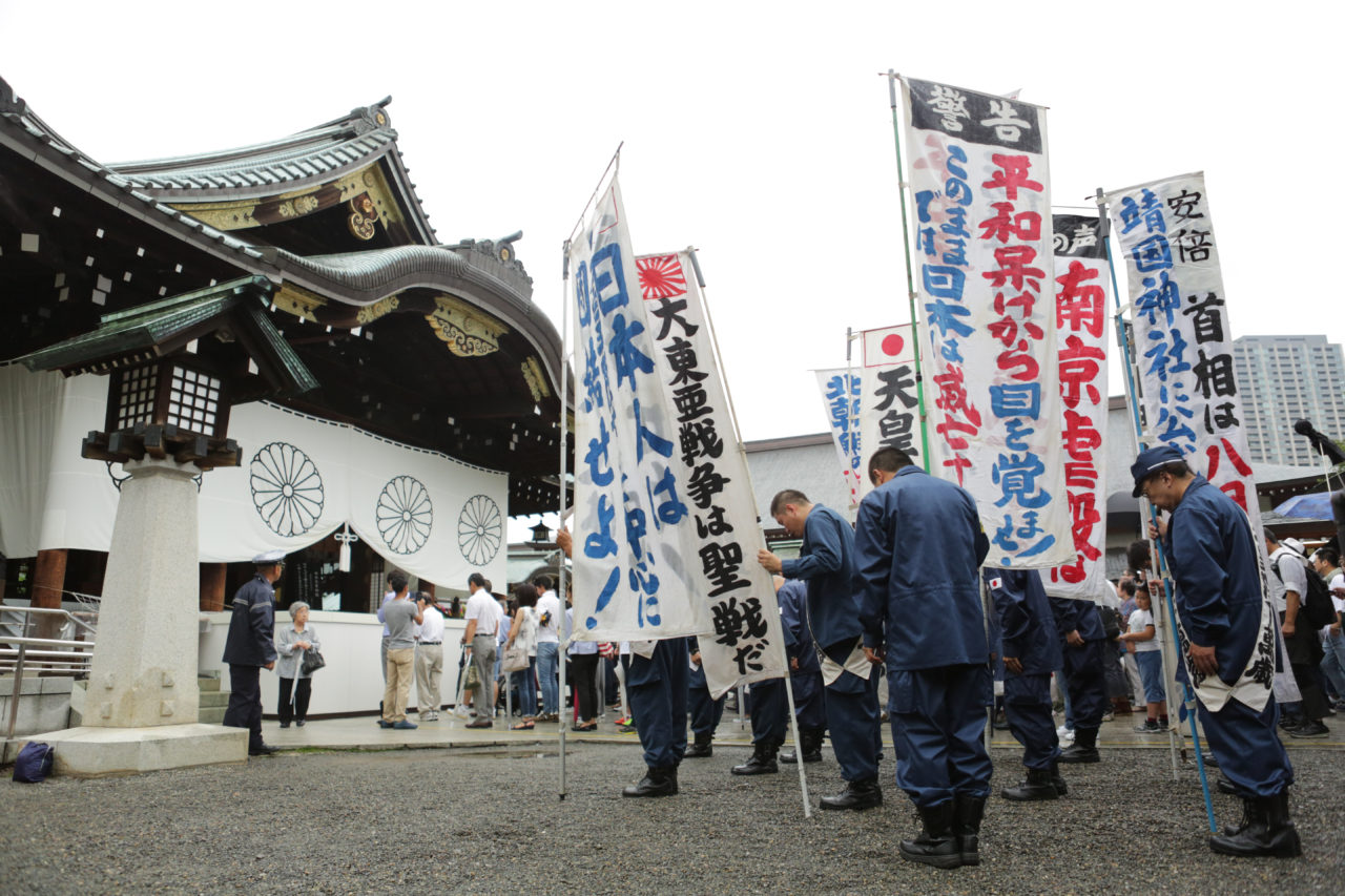 Một nhóm người theo chủ nghĩa dân tộc đến cầu nguyện ở đền Yasukuni.