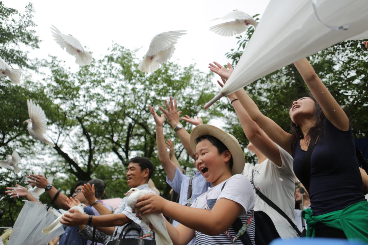 Người dân Nhật thả chim bồ cầu để tưởng niệm những người đã khuất trong chiến tranh. (Hình: Getty Images)