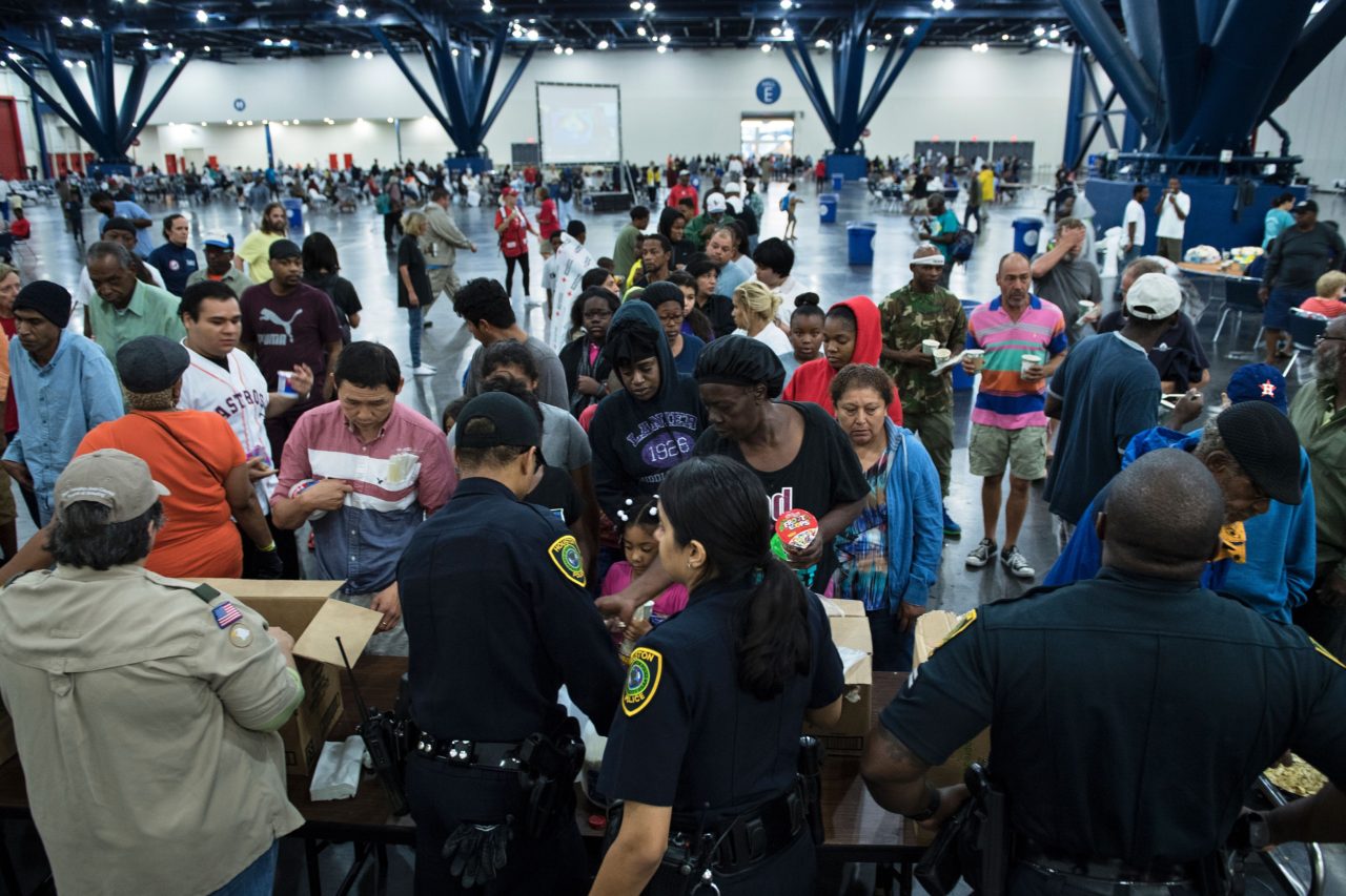 Người dân lánh nạn tại trung tâm hội nghị George R. Brown. (Hình: BRENDAN SMIALOWSKI/AFP/Getty Images)