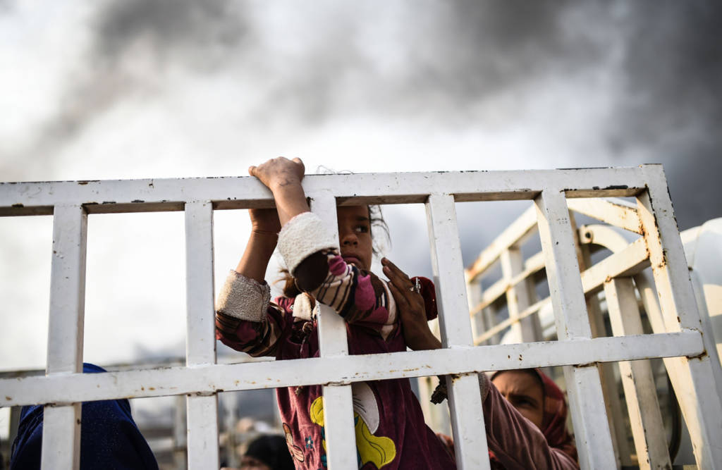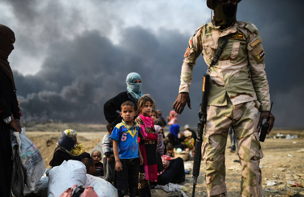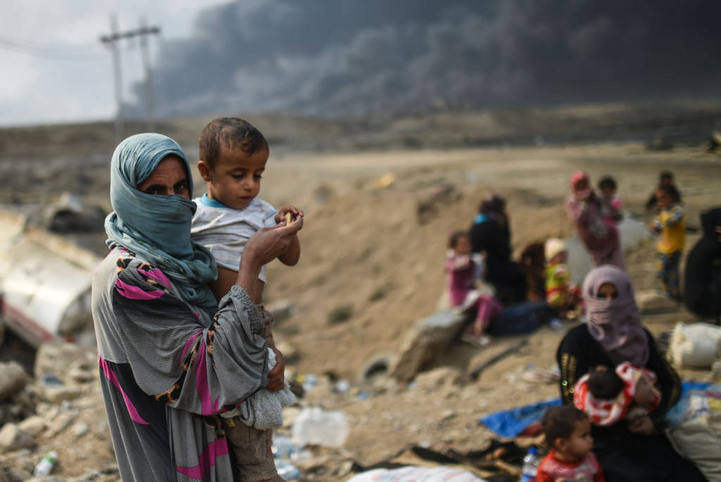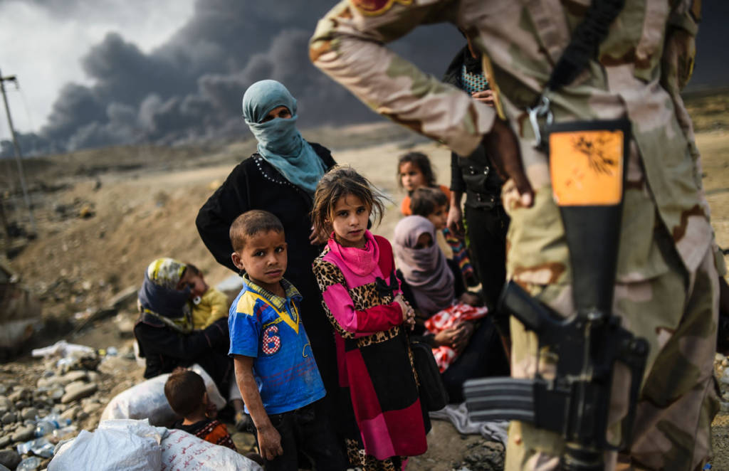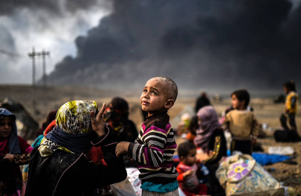 Hàng ngàn trẻ em vô tội đang sống trong cuộc chiến đẫm máu bởi lực lượng Iraq chống lại chiến binh thánh chiến của nhóm Nhà nước Hồi giáo để chiếm lại thành phố Mosul trong một khu vực gần Qayyarah vào ngày 24 Tháng 10 năm 2016.Cơ quan tị nạn Liên Hiệp Quốc đang chuẩn bị để nhận được 150.000 người Iraq chạy trốn chiến đấu xung quanh các nhóm tổ chức thành phố Mosul Nhà nước Hồi giáo trong vòng vài ngày tới.Những bà mẹ và những đứa con thơ không biết tương lai sẽ đi về đâu ?Không biết còn bao nhiêu trẻ em vô tội còn kẹt lại trong cuộc chiến ở Mosul. Một cậu bé trai Iraq với chiếc khẩu trang chông khói bụi chiến tranh.Những đứa bé thơ ngây không thể nào hiểu được về chiến tranh mà người lớn gây ra. Một cô bé gái đang nhìn xa xăm về hướng ngôi nhà mà gia đình cô đã bỏ ra đi.Nước mắt trẻ thơ ở địa ngục Mosul.Cơ quan tị nạn Liên Hiệp Quốc đang kêu gọi sự giúp đỡ của thế giới văn minh.Chiến tranh không chỉ là nỗi ám ảnh thương tâm cho những đứa trẻ ngây thơ vô tư mà cho cả những dân tộc yêu chuộng hòa bình trên thế giới. (Hình ảnh : BULENT KILIC/AFP/Getty Images)
