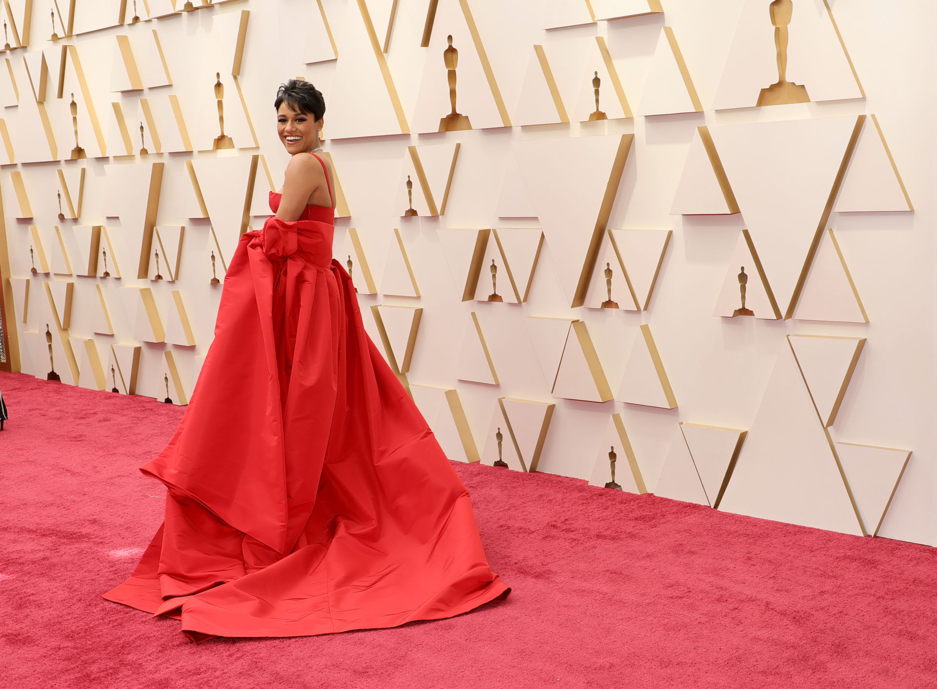 Là nữ diễn viên gốc Phi và La Tinh đầu tiên đoạt giải Oscars, Ariana DeBose cũng rất biết cách để làm mình nổi bật hơn thảm đỏ khi chọn trang phục màu đỏ rực đặc trưng của nhà mốt Valentino.