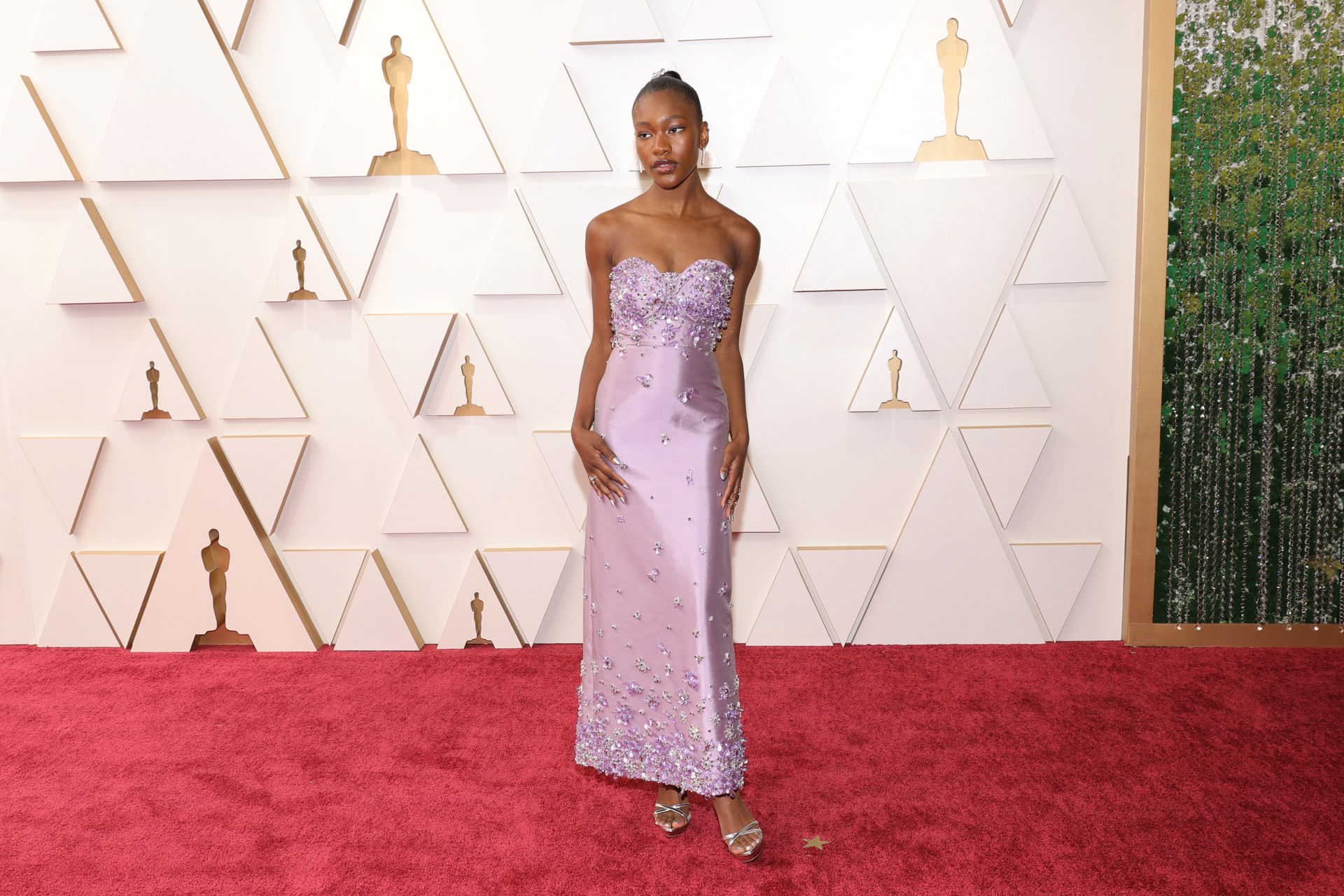 Chiếc đầm tím lilac đính họa tiết hoa tỉ mỉ của nhà mốt Miu Miu được Demi Singleton chọn trong lần xuất hiện trên thảm đỏ Oscars năm nay dự đoán sẽ thành mốt trong thời gian tới.