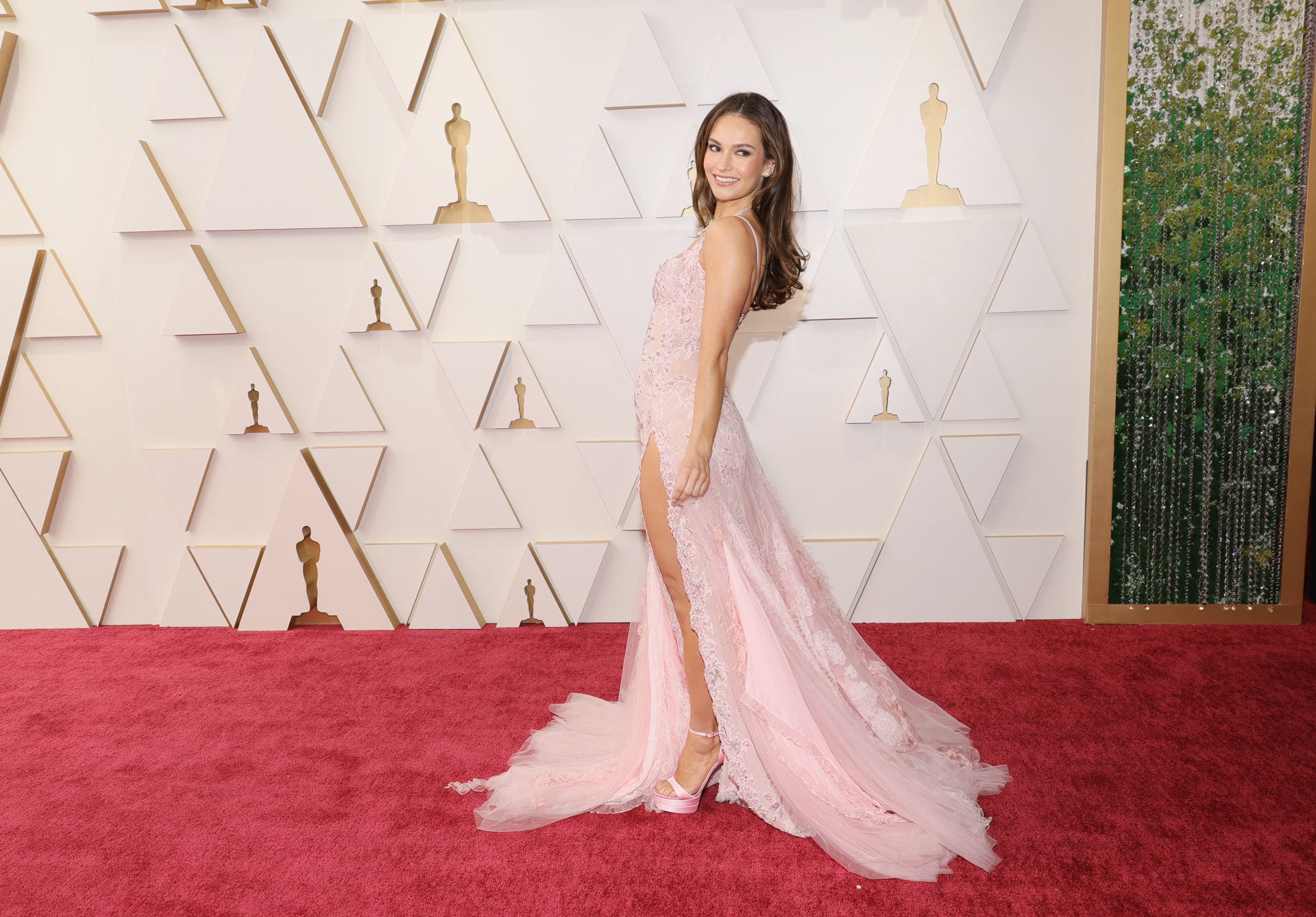 Nữ diễn viên người Anh Lily James vô cùng ngọt ngào và quyến rũ khi chọn chiếc đầm màu hồng phấn nhạt xẻ tà cao của thương hiệu Atelier Versace, phối cùng với chiếc giày cao gót cùng tông cực kỳ “công chúa” và nữ tính.