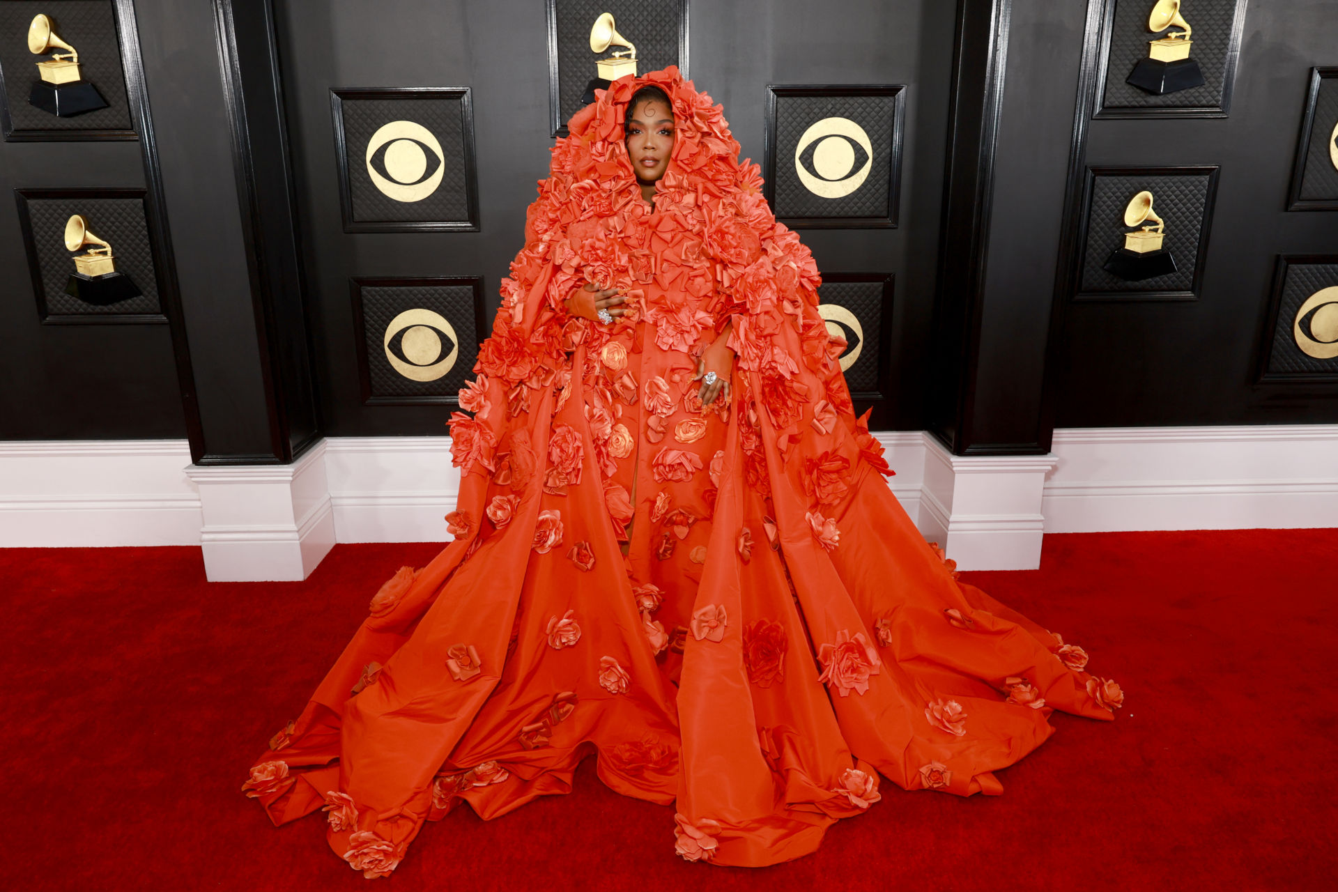 Chủ nhân của ca khúc đình đám “Truth Hurts,” Lizzo, tự tin khoe vóc dáng đẫy đà của mình trong bộ cánh đỏ cam rực rỡ của thương hiệu Dolce & Gabbana, được đính bằng tay với họa tiết hoa to bản đặc sắc.