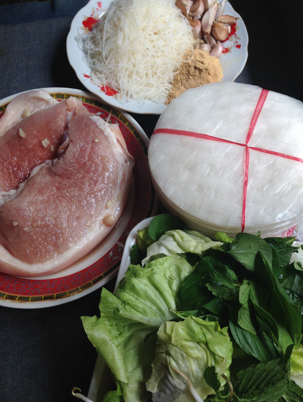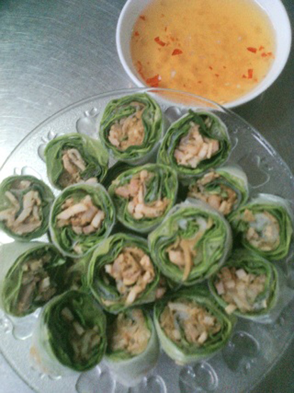 Trải bánh tráng ra đĩa xoa chút nước cho dễ cuốn cho xà lách rau sống vào, cho thịt bì đã trộn vào cuốn chặt tay là được.